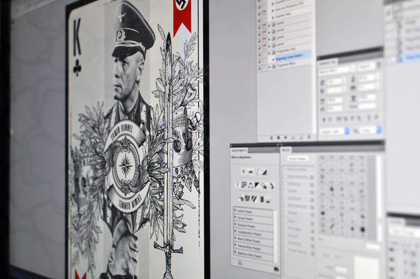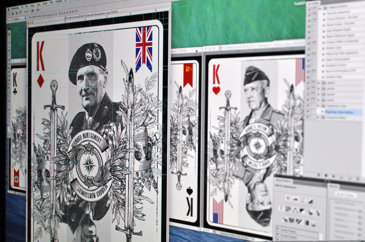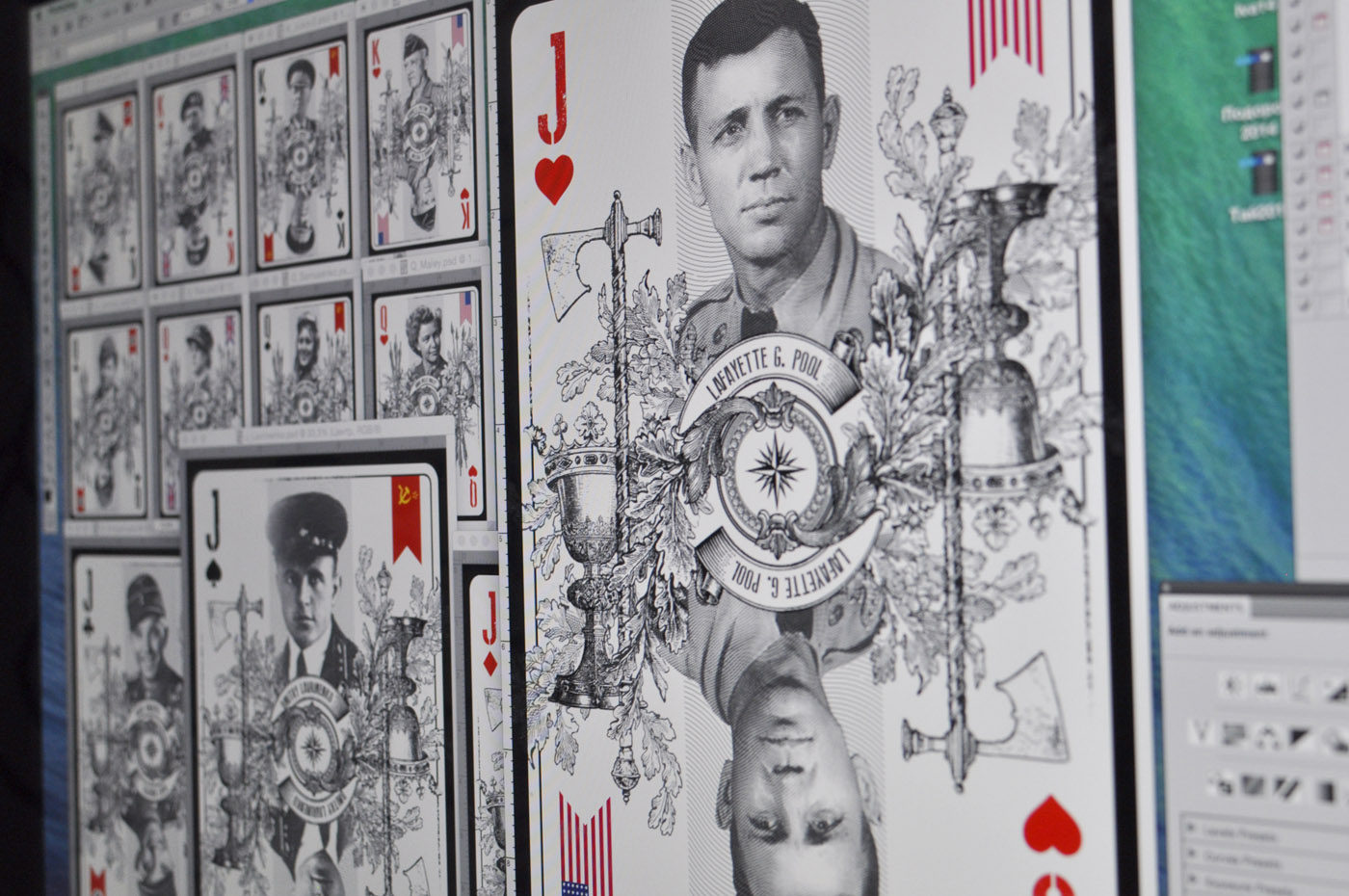 Thanks for the idea, but there are two countries that don't have any attitude to the ancient swords - USSR and USA. maybe I"ll use military sabres of that time (WW2). The idea was to use classical elements for all the cards (bay leaf, skull and a sword as a symbol of the warrior). There will be another arms for queens and jacks.