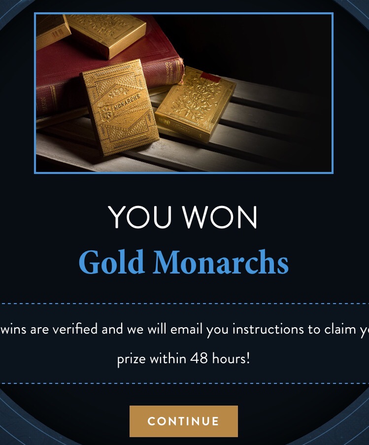 50 Points. Well, after I pointed out that no one was winning at the wheel, we started getting some winners. No ultimate playing card collections yet. Although, I did pick up 15 decks from them for $100, including a free Golden Monarchs, so I am still very pleased with the Black Friday deal.