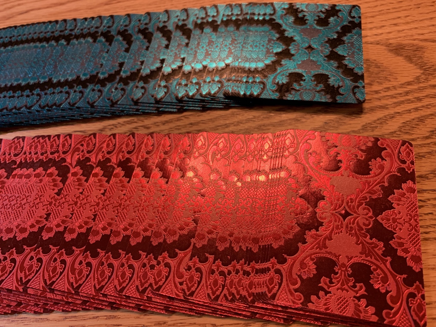Oh believe me, picture do not do justice to Damask. It is amazing. It must be held and put under a light to see all the intricate foilwork Lotrek put on them. I opened my decks as well but looking at Arabesque and Damask, it felt almost sacrilage to shuffle these works of art!TwoPiece wrote:I bought 0. You losers gave me enough pictures to live vicariously through UC.