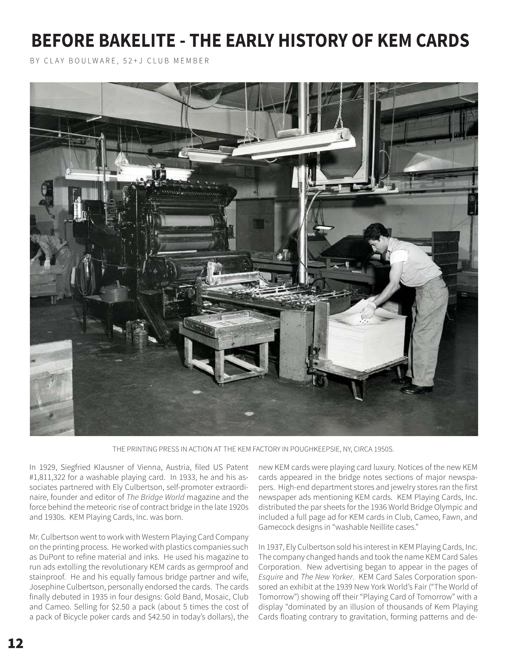 Here's an article I wrote a few years ago on the history of KEM Playing Card Co. for Card Culture at 52+J. Holds up pretty well, but I discovered a few more things than are in the article. If you are interested, I can send you a pdf version.