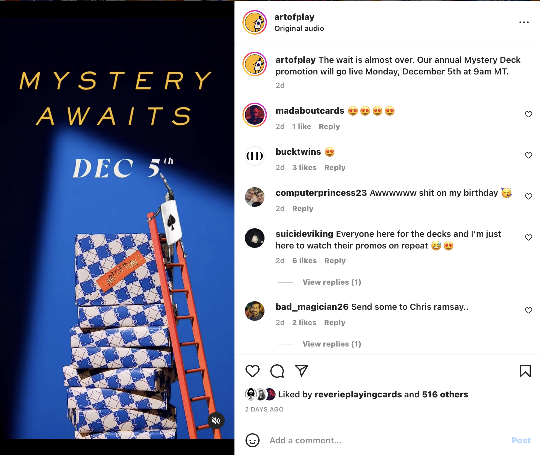 Instagram wrote:The wait is almost over. Our annual Mystery Deck promotion will go live Monday, December 5th at 9am MT.