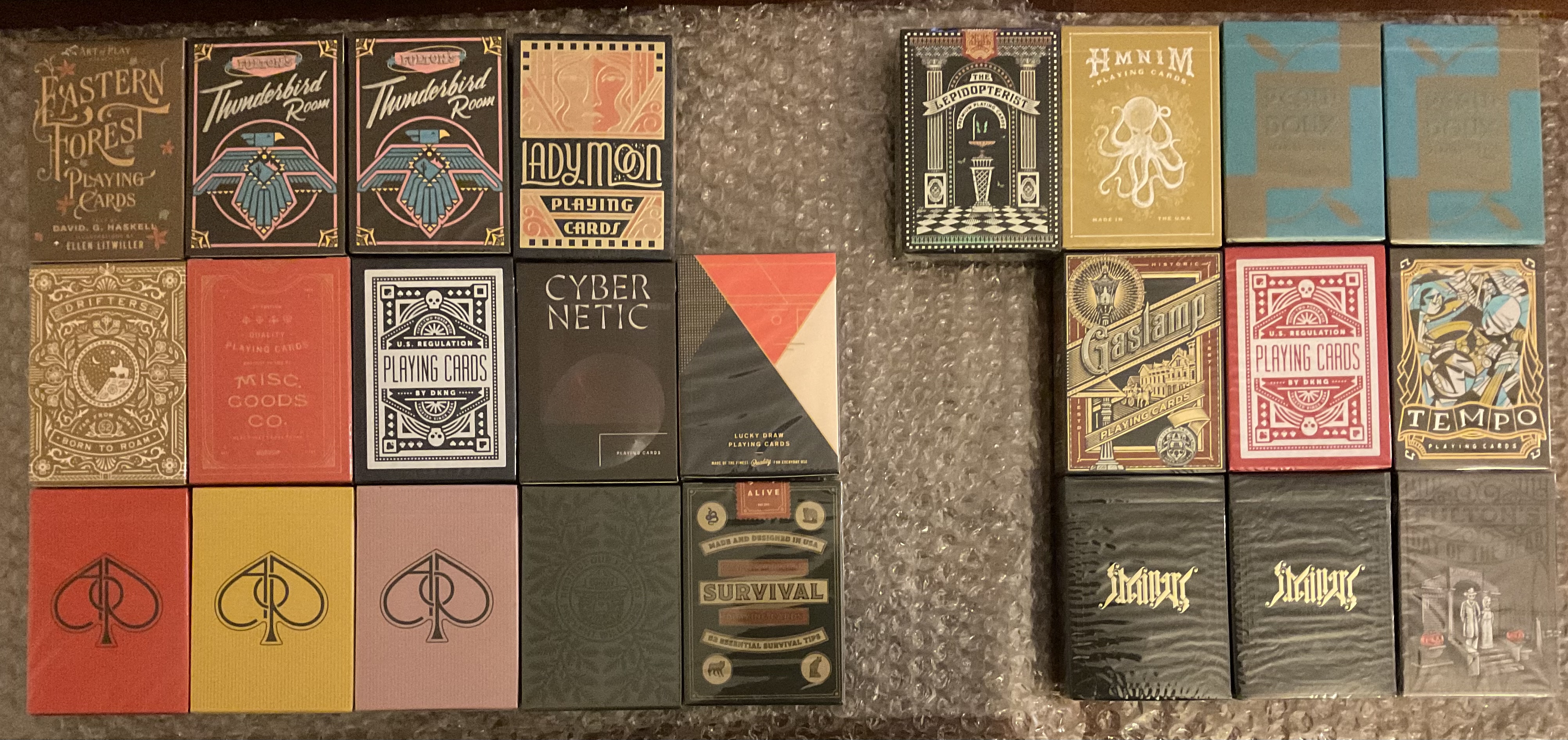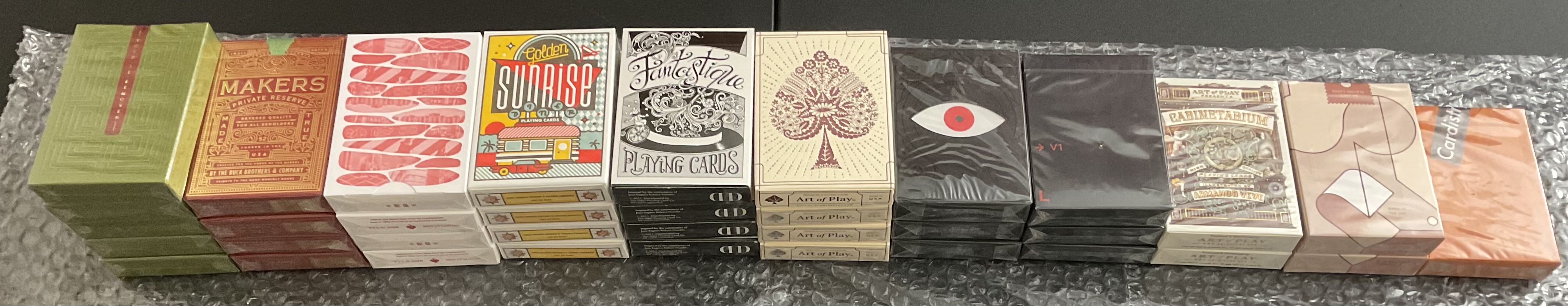 Art of Play Brand Deck, Balance - Black Edition, Bruce Lee, Cabinetarium - Gilded Edition, Cabinetarium - Standard Edition, Cybernetic, Day of the Dead, Dinosaur, DKNG Blue Wheels, DKNG Red Wheels, Drifters - Gold Edition, Eastern Forest, Gaslamp - Black Box Edition, HMNIM Gold Edition, HMNIM Gray Edition, If an Octopus Could Palm, James Coffee - Orange Edition, Lady Moon, Lucky Draw, MAKERS PR - Gilded Edition, MAKERS PR - Standard Edition, Mindfulness, Misc Goods, Modern Times, NOC Mint, Odd Bods, Overlook, Patina Lepidopterist, Peau Doux - Turquoise Edition, Bloc - Plush Edition, Smokey Bear - Special Green Edition, Standards Blue, Standards Pink, Survival v1, Tempo, Thunderbird Room, Ultimate Deck
