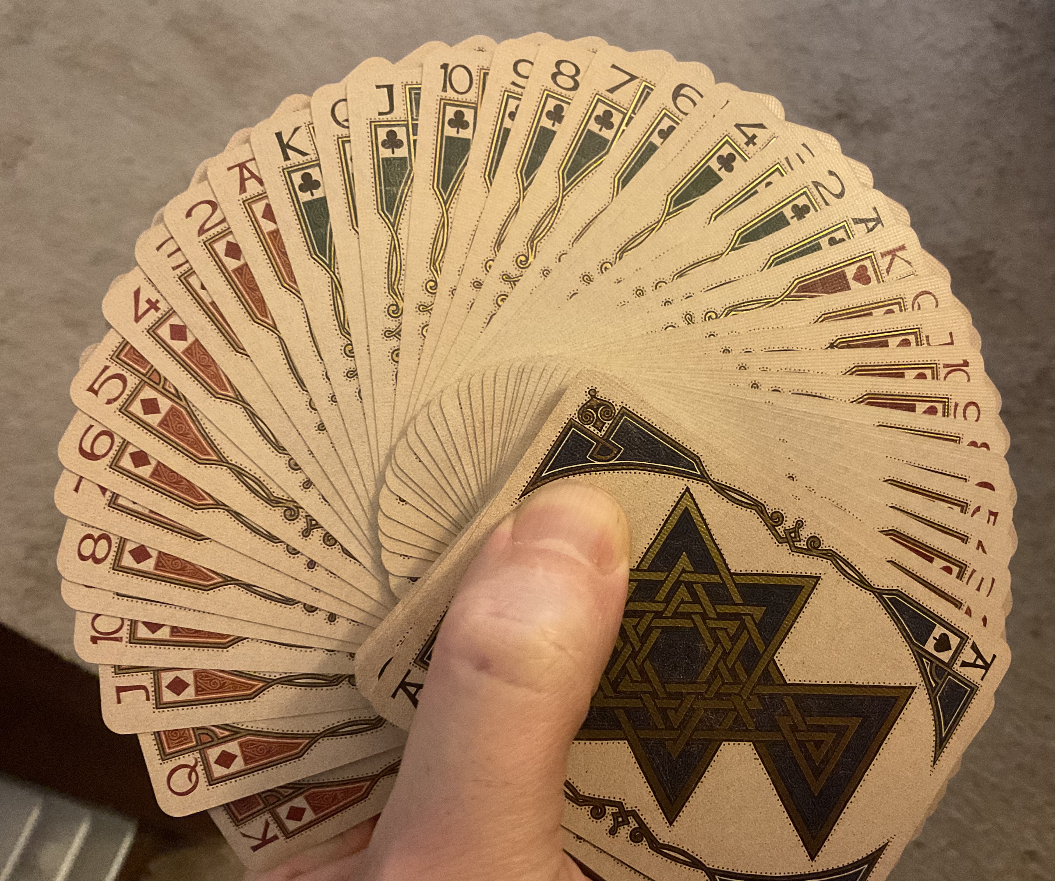 Yes, this isn't a perfect fan. That's an artifact of me not being a perfect fanner. But, that little bit of unfanned cards on one end isn't the result of clumpy cards; it's just me being less than perfect on my very first attempt at fanning this deck.