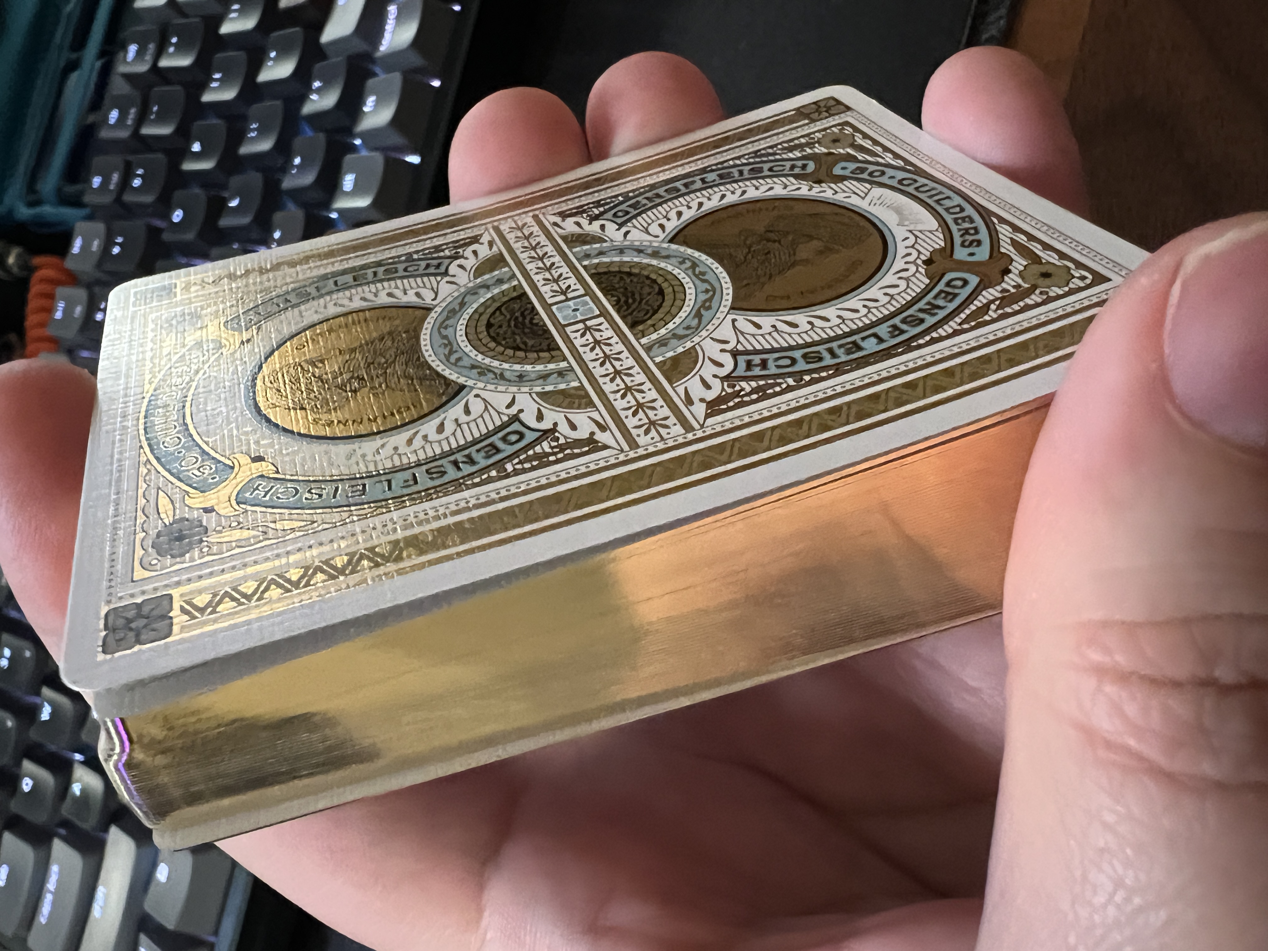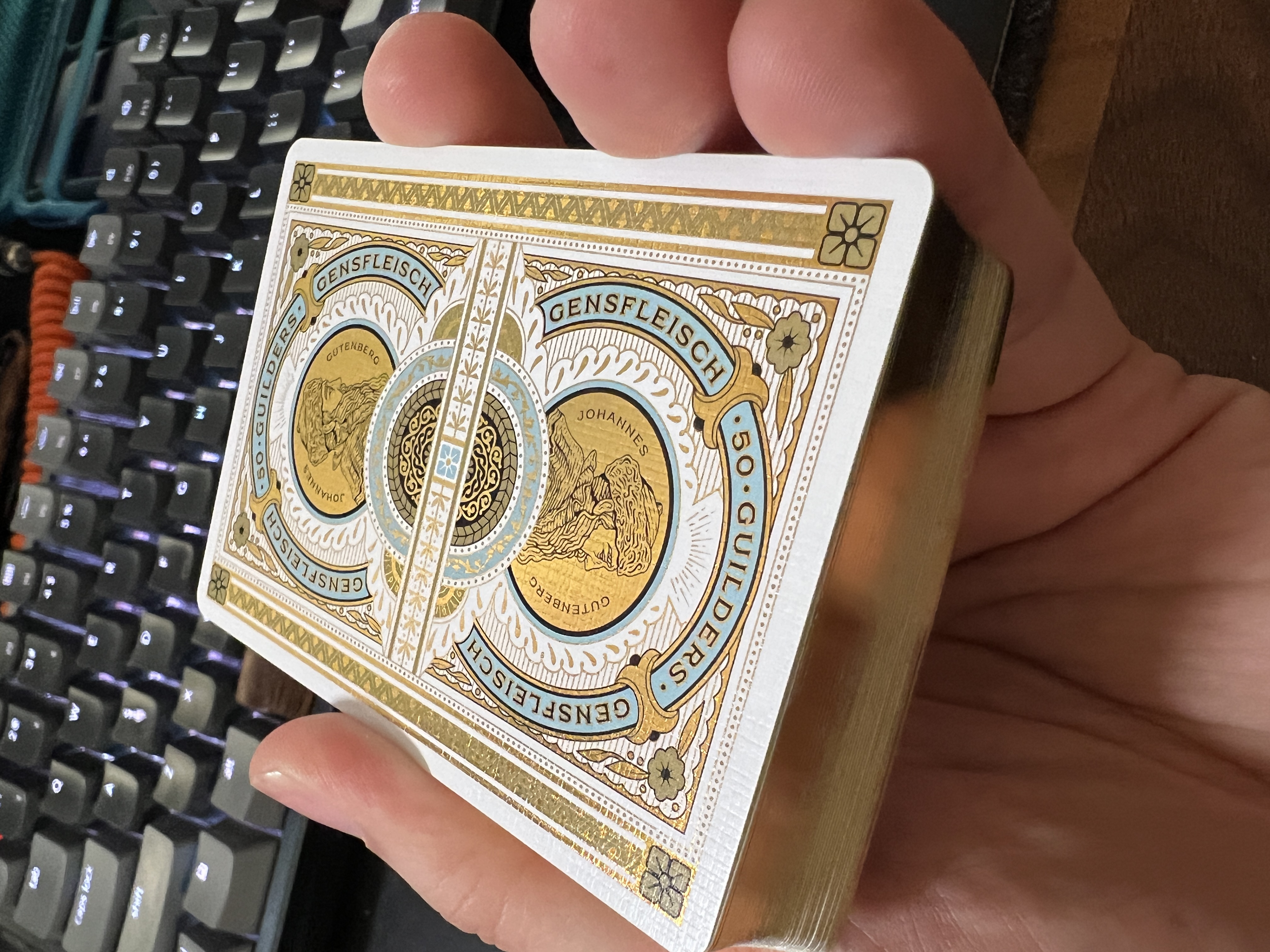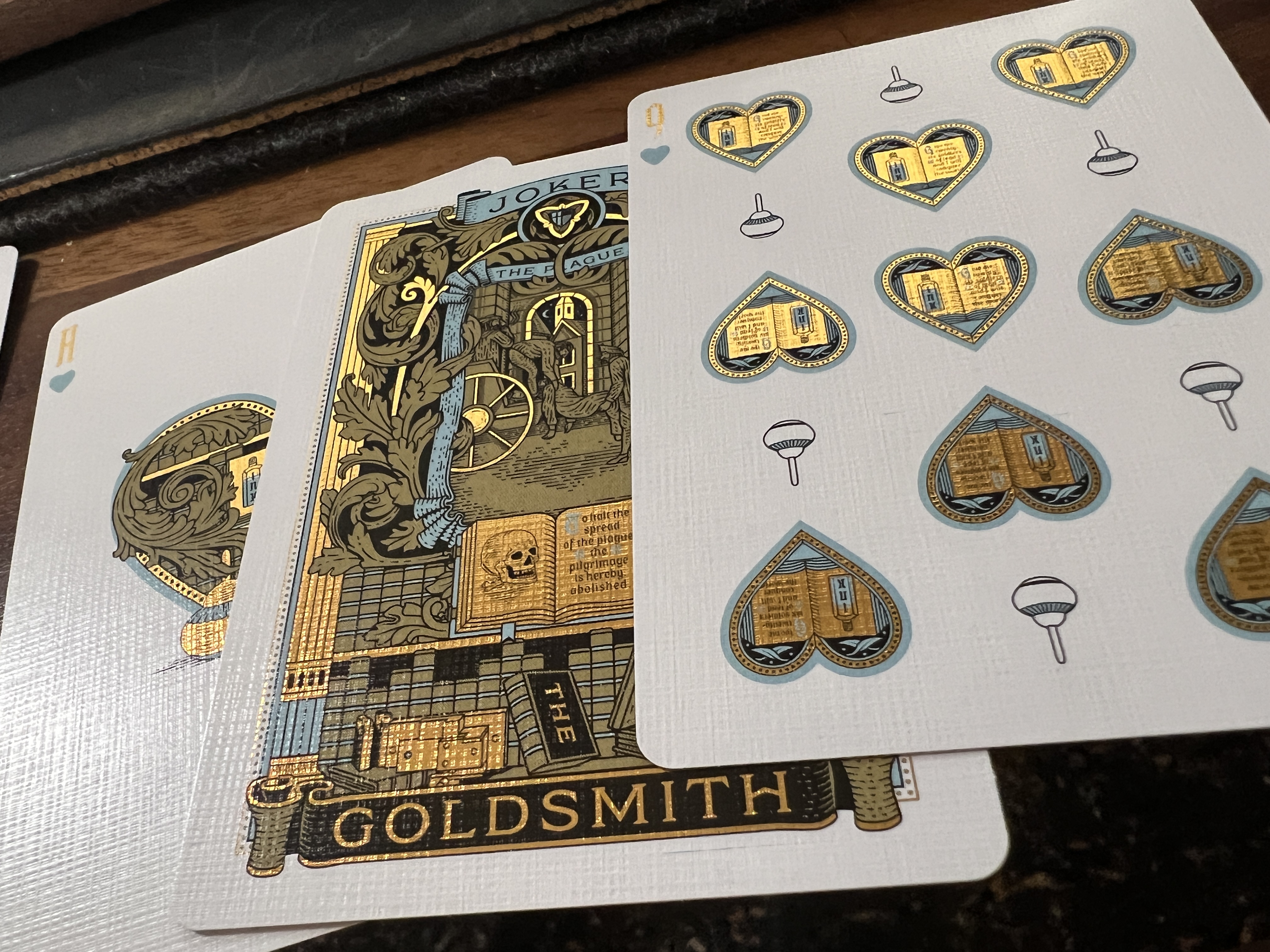 Evidently, the middle row has two decks stacked on top of each other. Odd choice. Regardless, neither deck has gilding, and the carat case will be walnut treated with linseed oil--like Lorenzo's patreon case. ANd of course no coin is included on T11's set.