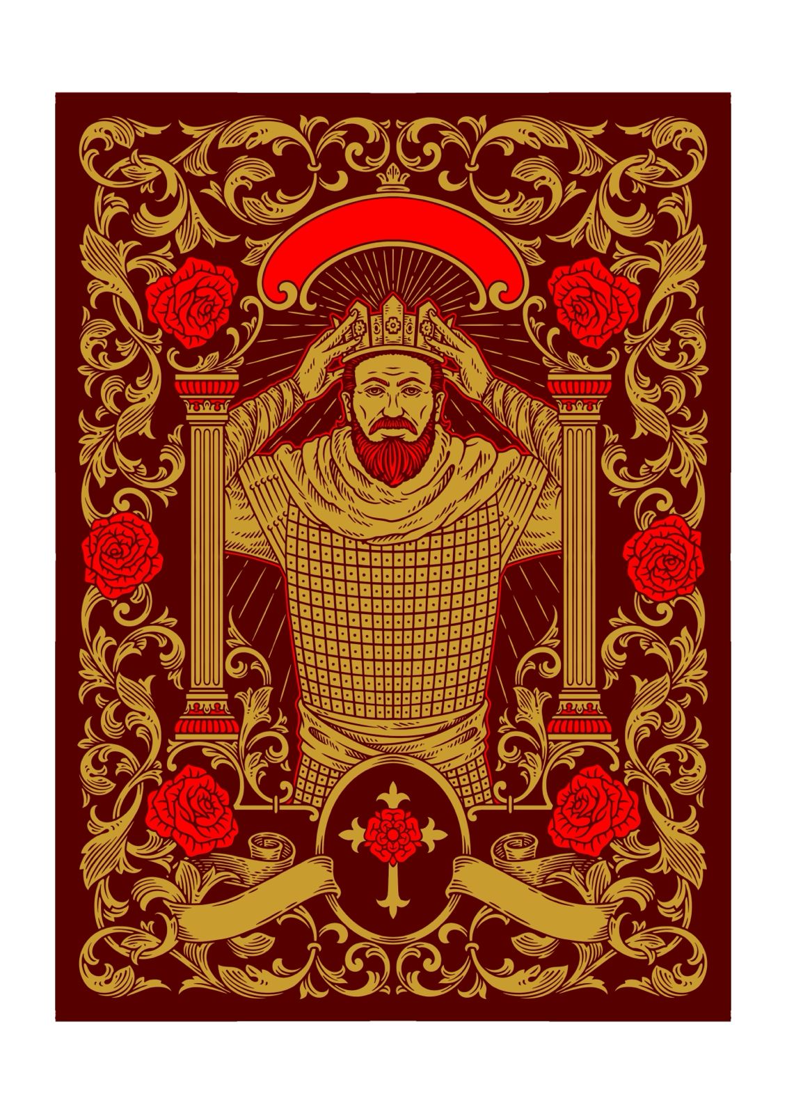 - The club pip represents the royal court of Macbeth and Lady Macbeth. This was the second most challenging thing to figure out due to the unique shape of the pip. We then decided on a cross to be incorporated with the pip as an ironic play. When the play was set in the 11th century, Christianity would have gained its foothold, and religion was heavily used as part of the royal assent. If you became a king or queen, you were effectively given the role by God, a.k.a God-given (divine) right to rule. Often, Christian symbolism uses bright and warm colours, such as white and yellow, as it was seen as purity and the symbol of light. Using that logic, the inverse should also be true, where dark colours like black would be seen as corrupt. So, we thought, why not stick the cross into the club pip and create the antithesis of Macbeth and Lady Macbeth?
