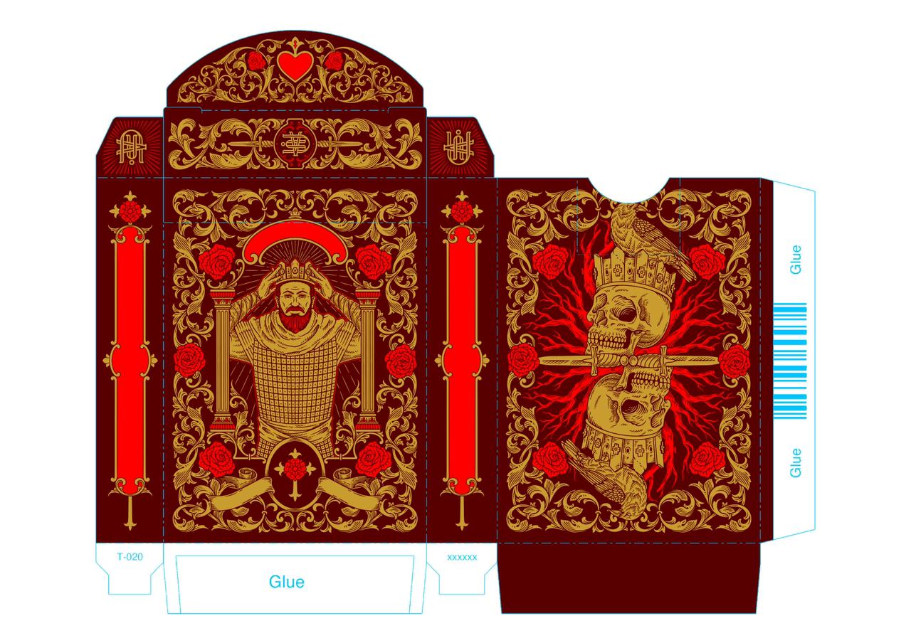 We have the final draft of the tuck box for the limited edition, which you can see below. Let us know what you think! Yes, the text is missing, but it will be in the final product. As mentioned previously, the lighter red you see for the roses, branches, and on the side of the tuck box is supposed to replicate the red metallic ink we plan to use.