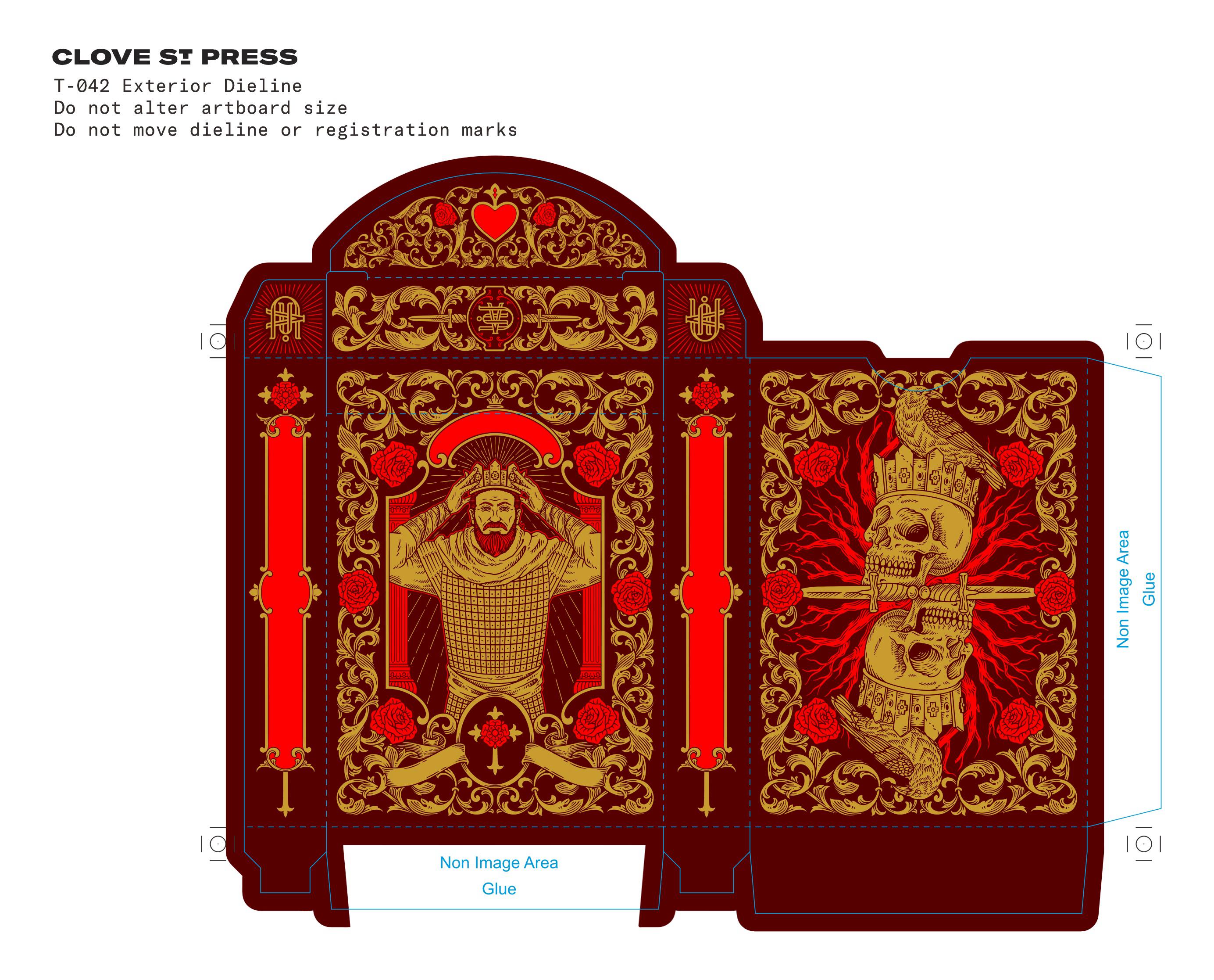 I've resized the designs to fit within the poker die lines from USPCC, as the original illustrations weren't within the safe printing lines for some reason. Two court cards should be revised in a couple of weeks, and then I'll transfer them to the poker die line. I will also need to look at how to do spot channels for the areas where metallic ink will be. If someone has access to Pantone Metallic Coated and/or Premium Metallic Coated, I would like to borrow it.