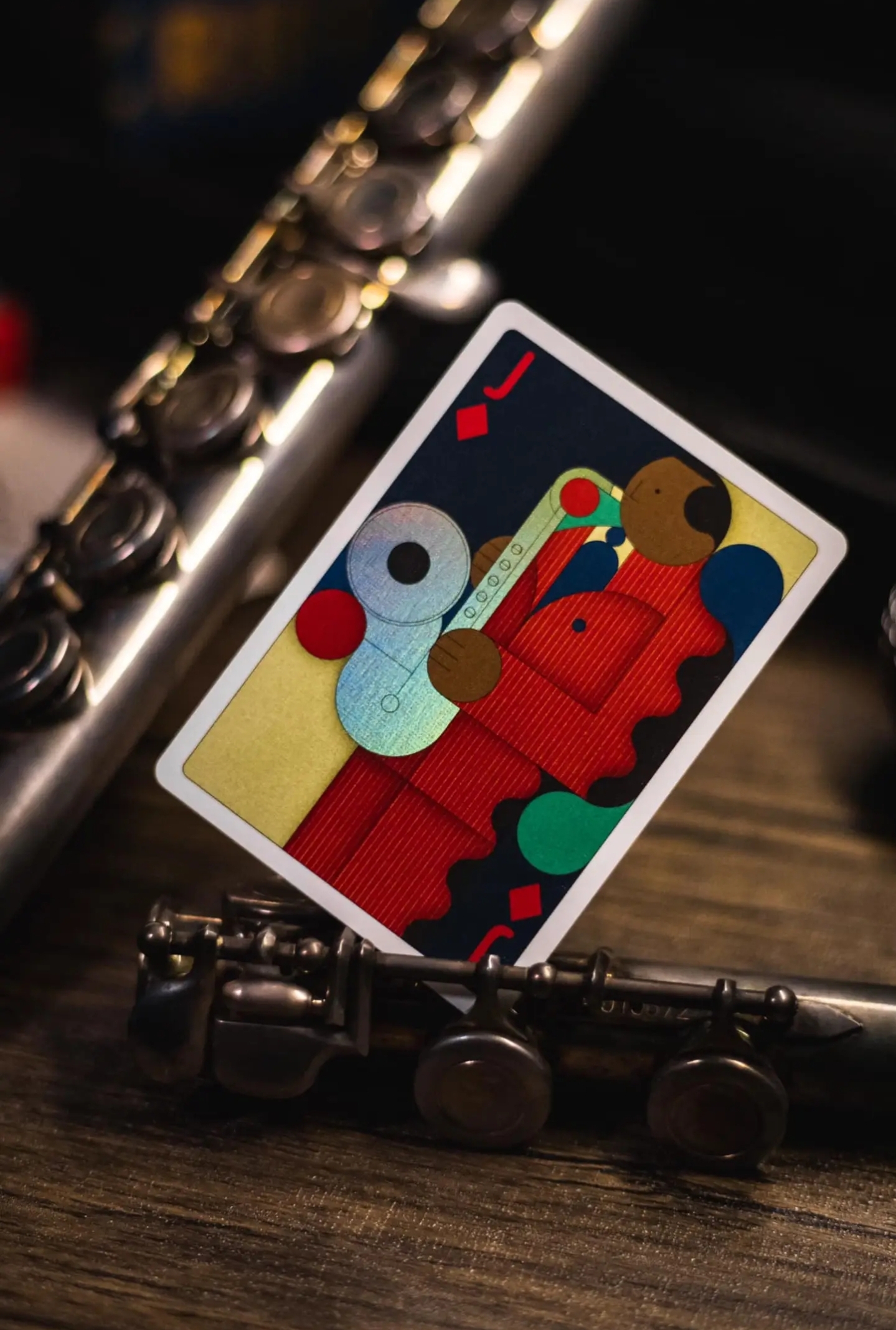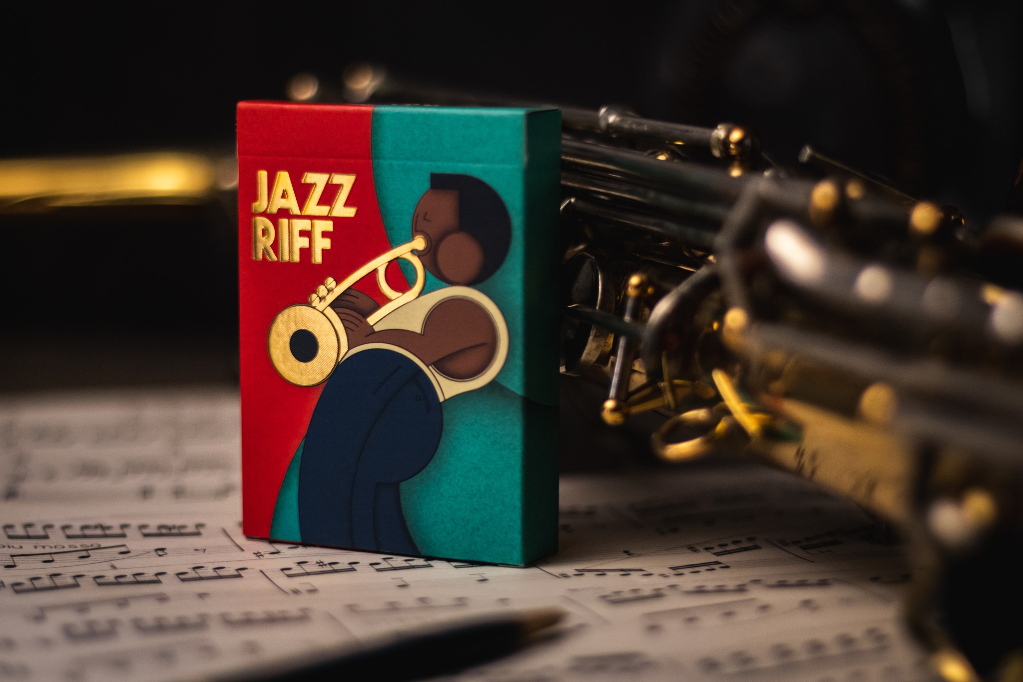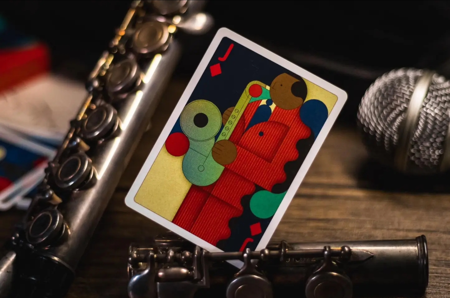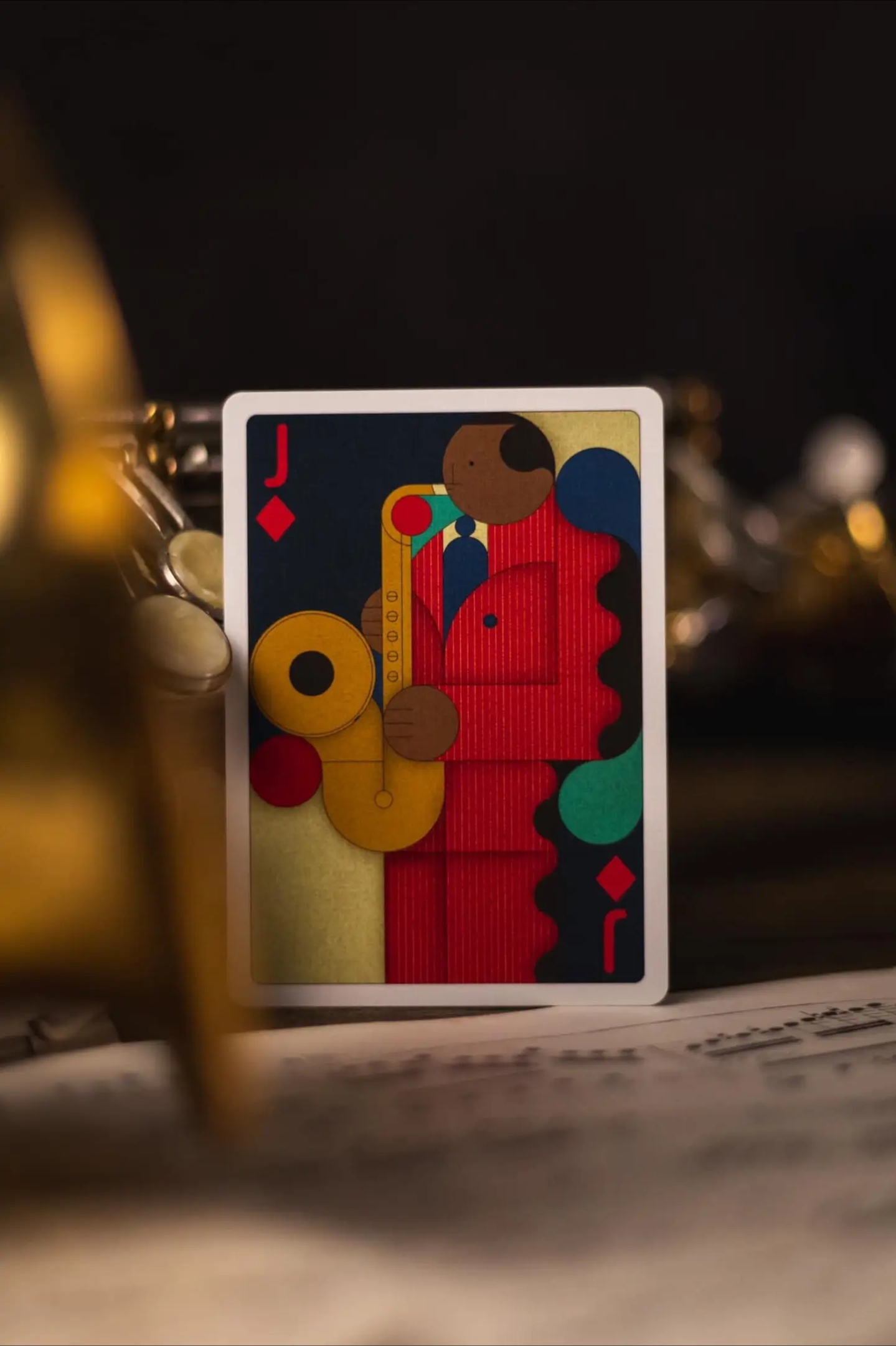 The card back of Jazz Riff playing cards features a sophisticated, seamless design where musical instruments flow into one another, embodying the improvisational nature of jazz. This intricate pattern creates a sense of depth and continuity, making it hard to discern where one instrument ends and another begins.
