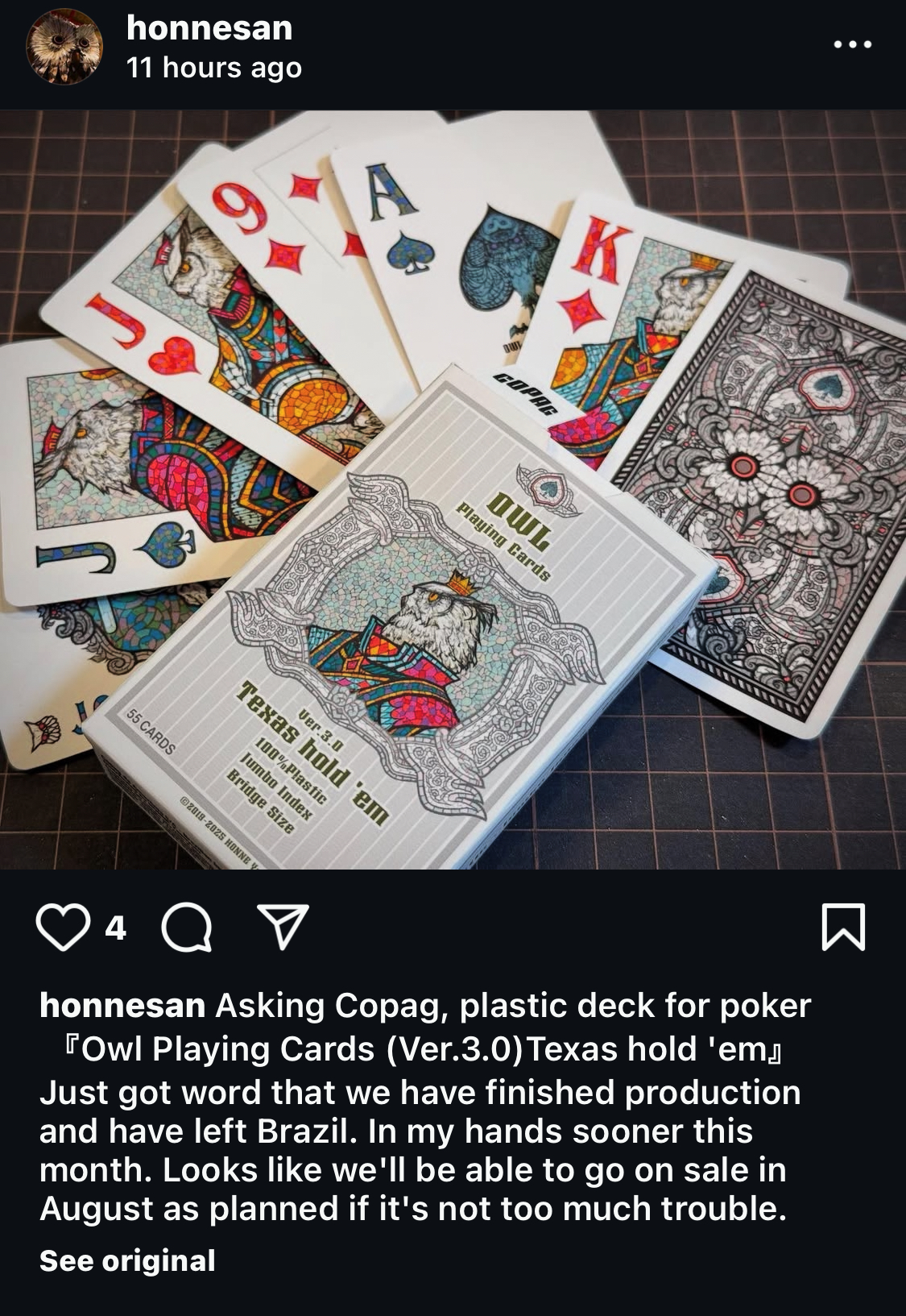 Maybe a part of his fanbase has been asking for plastic cards so he's catering to that market.I wonder if all the poker players who have wanted plastic until now will buy it. The quality is Copag, the bridge size, the jumbo index, so I made it a poker-specific type like no more.