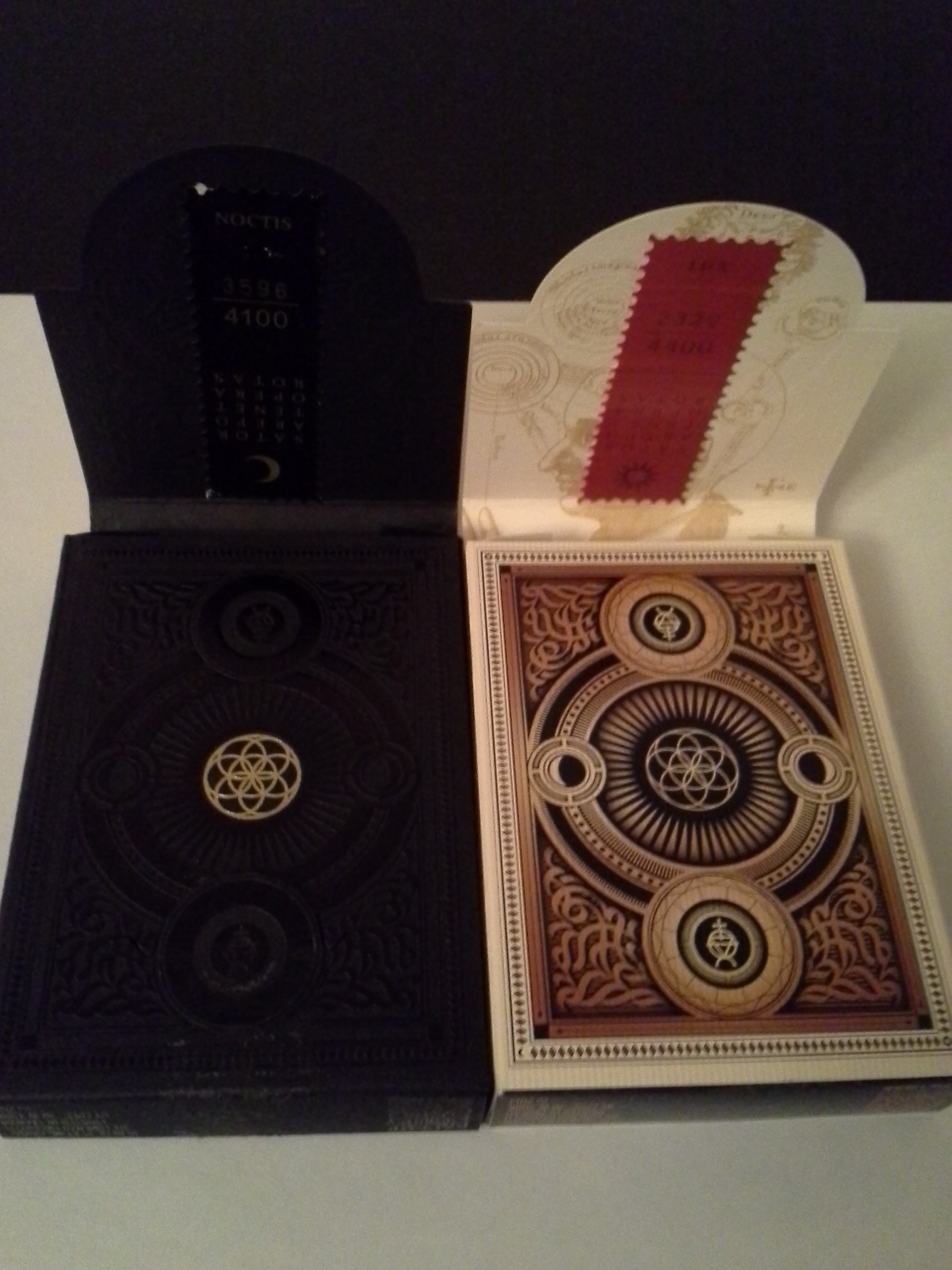 Got my decks, and I am blown away! Innovative tucks and exquisite artwork on the cards. The only negative is that its challenging to get the cards back into the tuck because of that damn bottom flap. Its also a shame these didn't arrive before the New Year so that they'd be eligible for the UC Deck of the Year contest. I'm going to have to remember to keep these in mind when voting for the 2015 contest next year, these decks are that good.