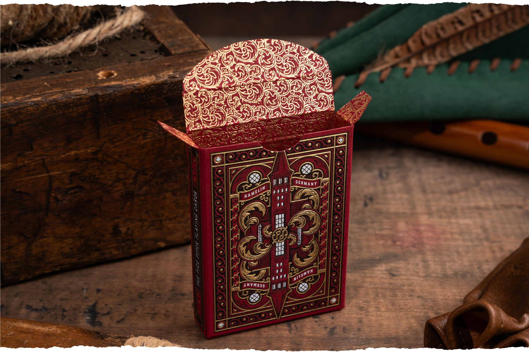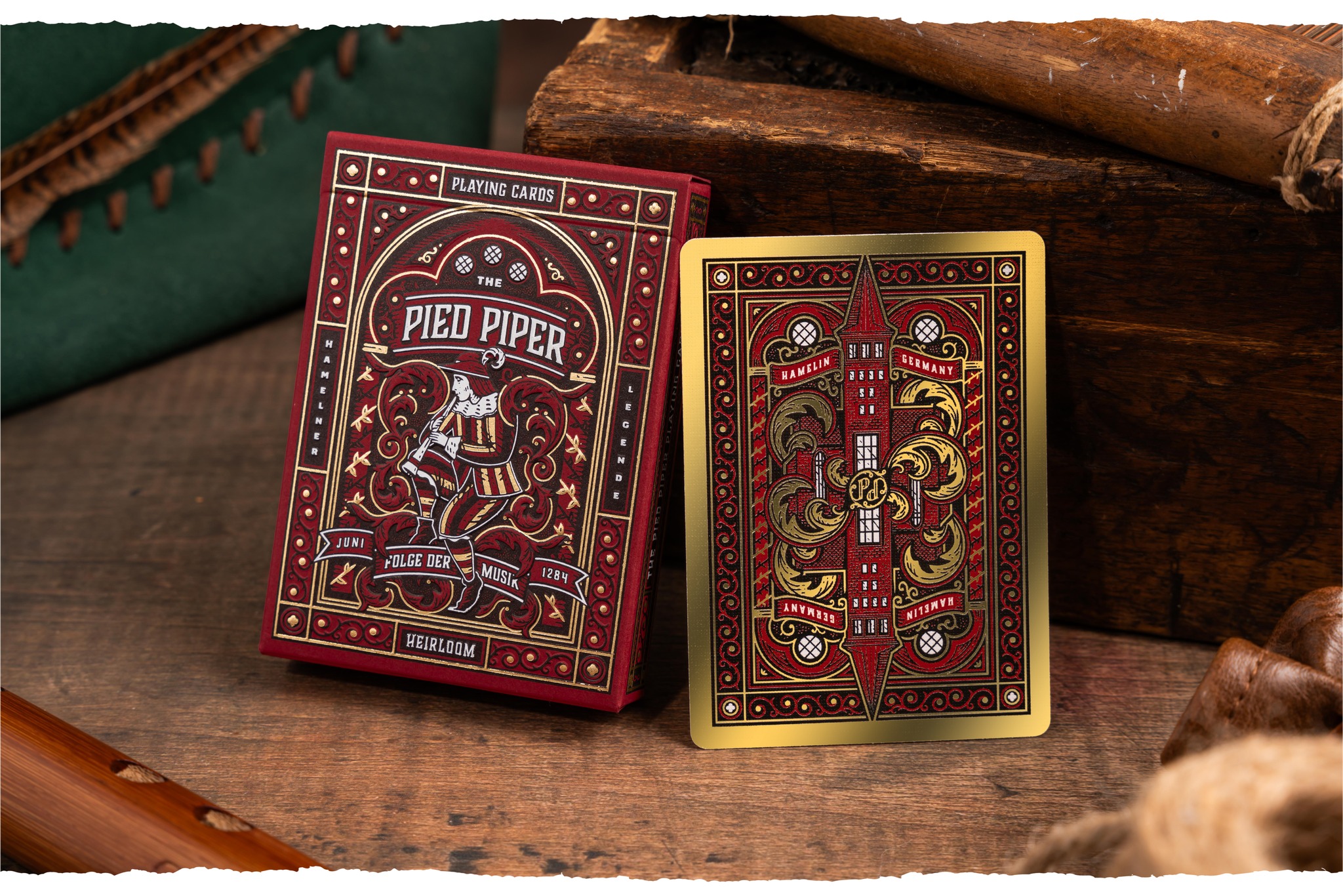 At the center of this edition is a beautifully illustrated card back featuring the Market Church of St. Nicolai (Marktkirche St. Nicolai), a landmark deeply woven into the story’s history. According to the legend, it is likely that within these very walls the parents of Hamelin were gathered to celebrate Saint John and Paul's Day, unaware of the sorrow unfolding outside as the Pied Piper led their children away. But the church’s role in the legend doesn’t end there. One of the earliest known depictions of the story was captured in a stained-glass window in the church preserving the memory of that fateful day for generations.