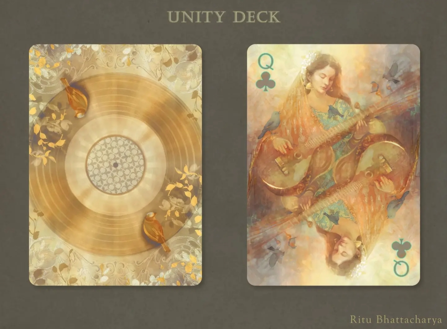 When both come together, they create a visual duet, where artistic mathematical patterns emerge out of music, and music emerge out of geometric patterns. This is what | have tried to capture in the 5's of this excellent Unity Deck, imagined by Dexter Amistad. It is an honour and a privilege to be a part of this wonderful concept, and I wish the very best for this project.