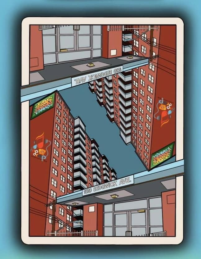 The card back is of 1520 Sedgwick Ave.... Recognized as the birthplace of Hip Hop.