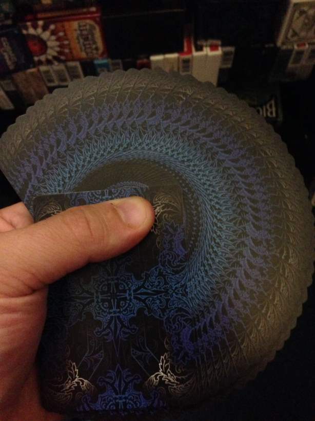 My only complaint about the cards is the pattern on the face goes all the way to the edge causing the Acqua to be distinguishable between black and red suits. On the Verde its not so bad because the two colors used were white for the black suits and light green for the red suits. On the Acqua, though, black was used for the black suits and white for the red suits. Here is the edge of the Acqua deck so you can see: