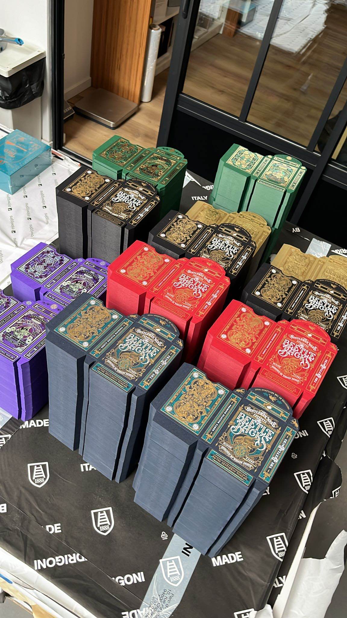 We've encountered a few inconveniences. For one thing, due to a mix up with WJPC the decks were shipped to my HOME rather than Gambler's Warehouse. I currently have 55 boxes of Beetle Backs in my dining room. This is less than ideal. Additionally JC of Studio Pression was recently ill and the brick boxes were not ready until recently. They are currently one the way to me so that I can pack and cellophane the bricks. I'm still trying to ascertain whether I will fulfill the decks myself or ship them to Gambler's Warehouse for a non insignificant amount of money.
