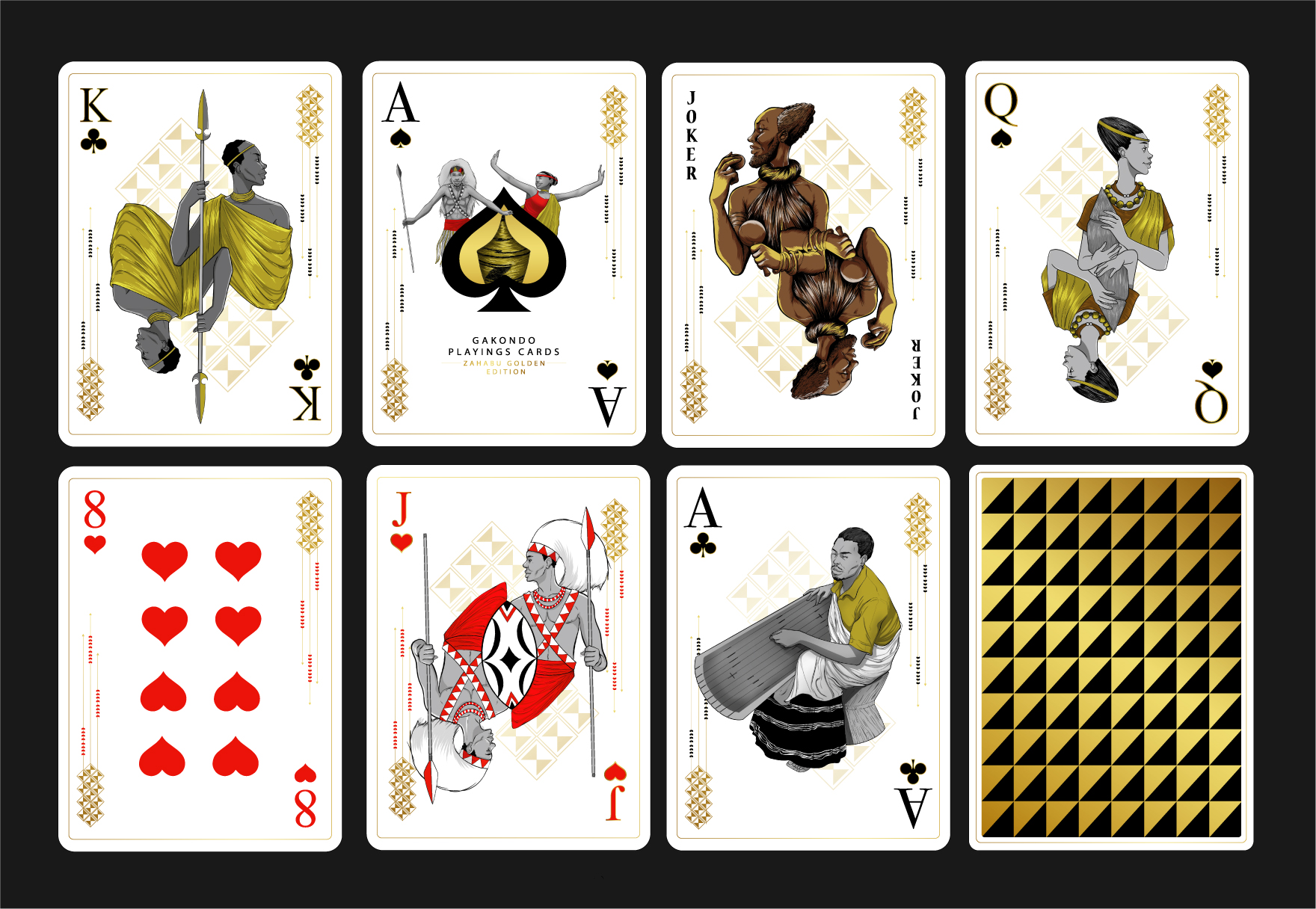 Instead of the normal red and black spades, hearts, clubs and diamonds, the Gakondo playing cards are colourful and feature cultural imagery images of an Igisabo (butter churn), inanga (music instrument), agaseke (the round woven basket), icumu (spear), ingabo (shield), and Imigongo (cow dung art) and with intore (traditional dancer) and old men dressed in the umwitero (traditional wear reserved for the noble class) on the front side of the cards.