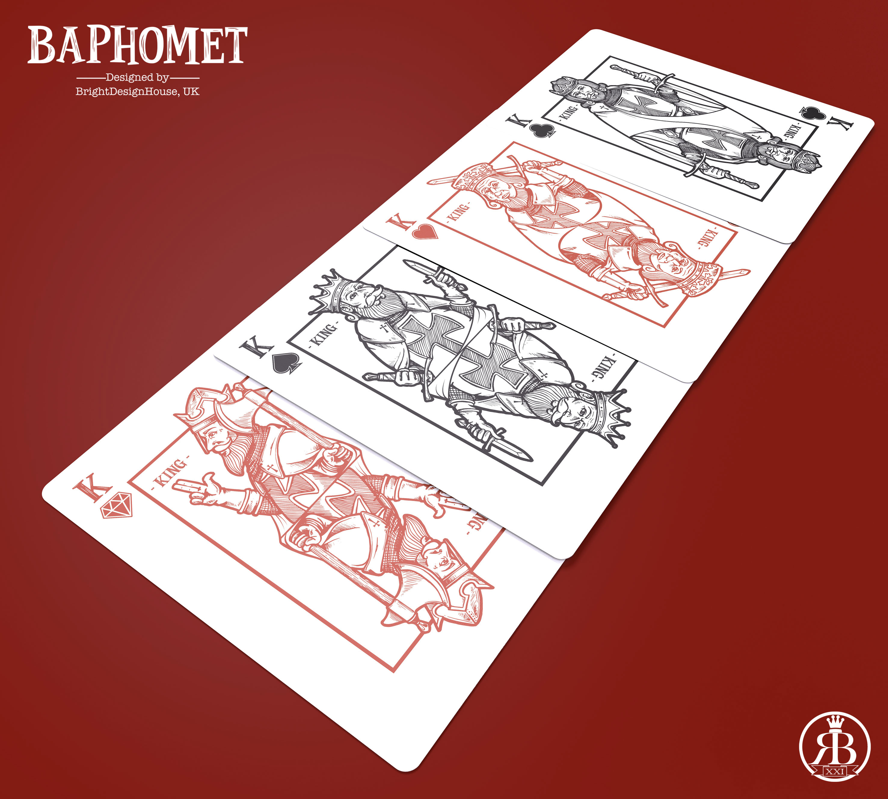 As discussed last year on the development message board I am looking to launch my Baphomet deck on Kickstarter this year. Printed be EPCC or Cartamundi - priced 'around' $15 depending on final cost of production, postage, fulfilment and tax. The deck will be a black and gold (how original) with fully custom court cards, jokers (2 the same and 1 surprise), gold cold foil reverse and a foil Ace of spades. The tuck will be on black art card with embossed gold foil detailing. 1000 numbered run with individually numbered seals.