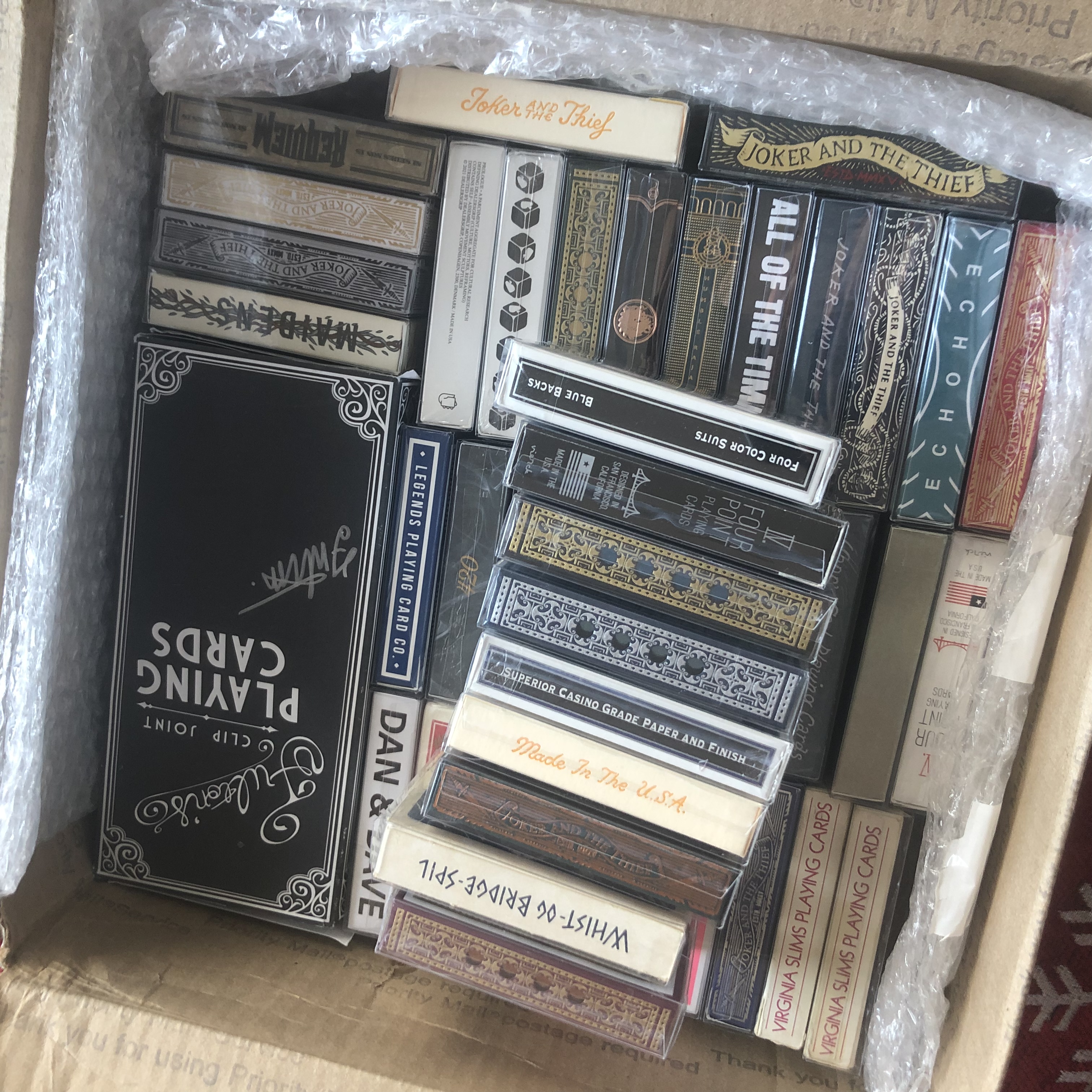 Had some Halloweenish stuff arrive but it's somewhere else. I'll snap something later probably. (maybe if I remember) This stuff came and got a snippity snap. All new to my collection. I'm not all anti-bridge sized decks like some folks are. They're playing cards and I like playing cards.