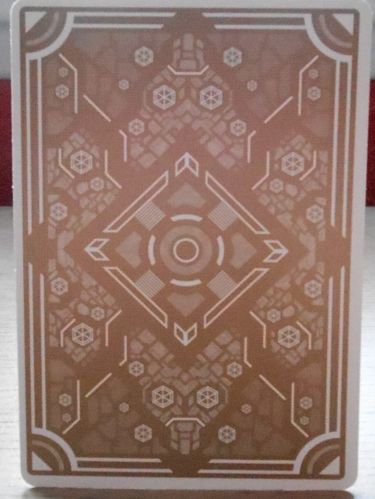 I really enjoy the back. It has symbols repeated again and again. The shapes form a bigger shape and although this is seen in many decks, I really enjoy how this deck has placed it together. Looking at the back design makes me feel like I am looking at a map of Utopia. With the small shapes being buildings and the big triangle in the center being the "central command" building. I'm strange, I know...