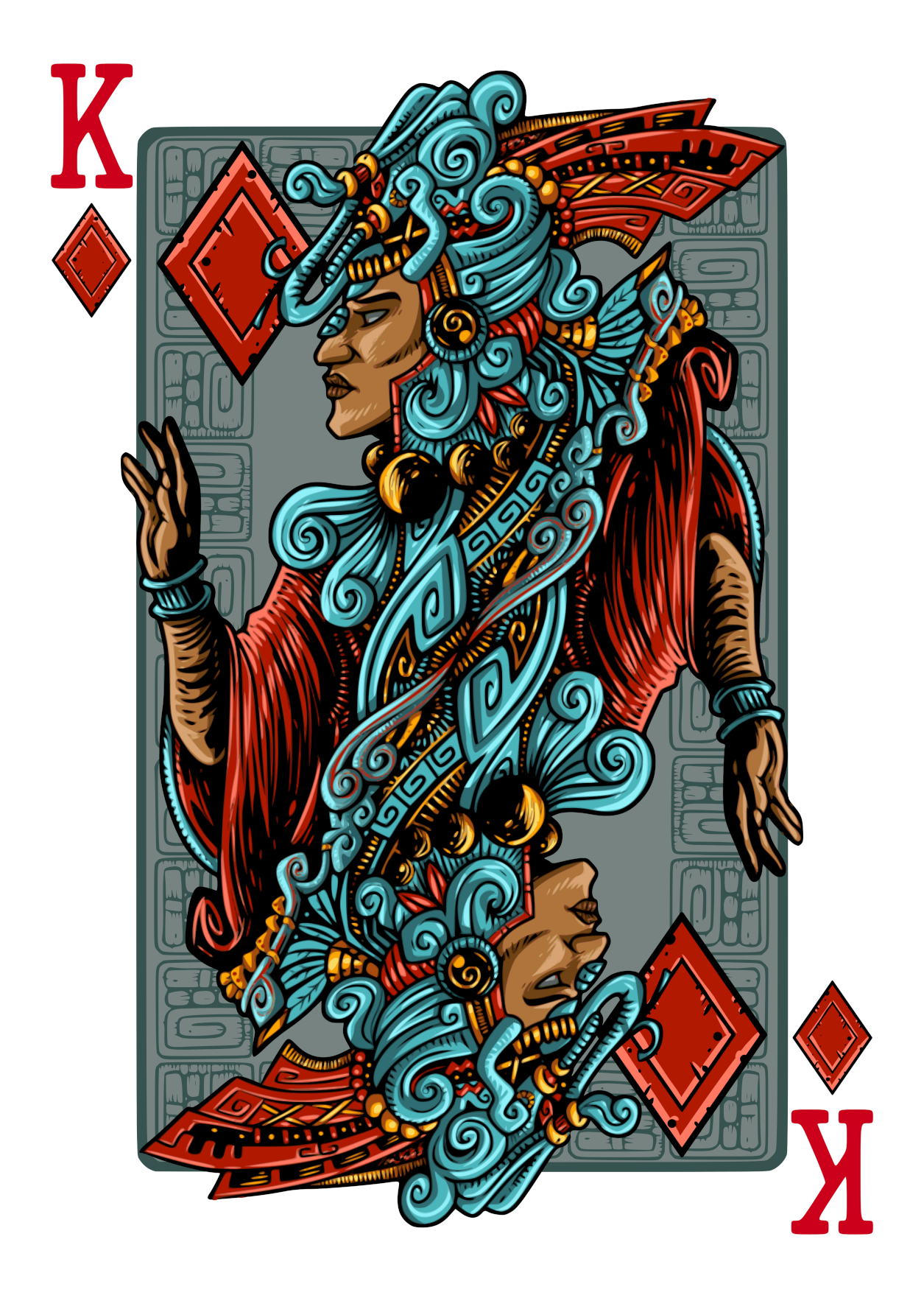 • Suits/pips - I know, this is a trade of topic as some people want/insist french pips but for me personally it makes no sense to have an Aztec/Mayan inspired deck to go french suits. Full custom pips/suits would be my approach. At the bare minimum I would go with Spanish/Latin suits (conquista and stuff)