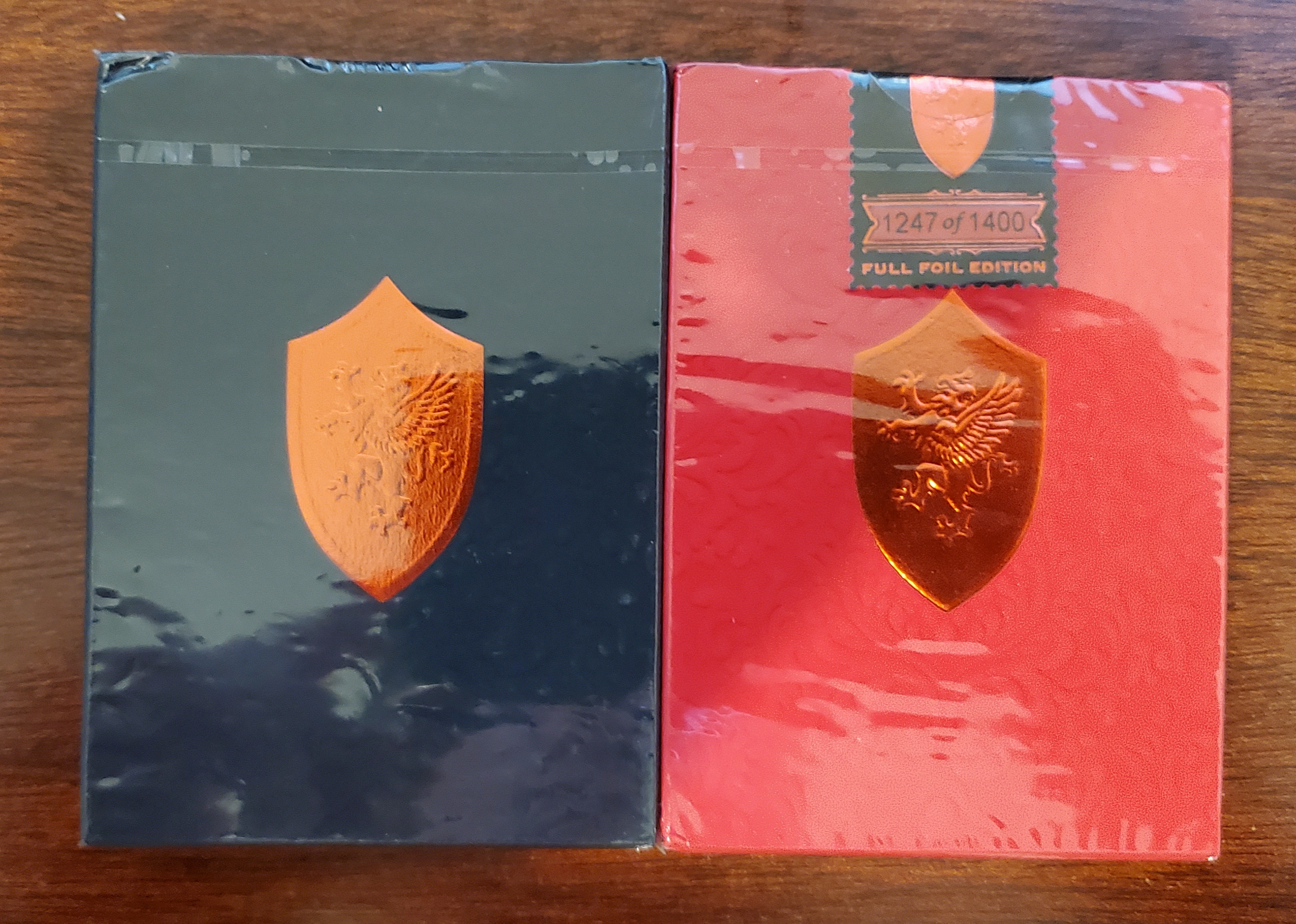 The art is gorgeous but I feel like if these were printed with USPCC or Cartamundi instead of Legends, with cold foil AND gilding on one of the decks, it would truly be a top-tier deck... It feels like the red foiled deck ought to be red gilded, too, while the gilding on the black deck feels out of place on the cards which appear quite plain immediately after seeing their full-foiled twins