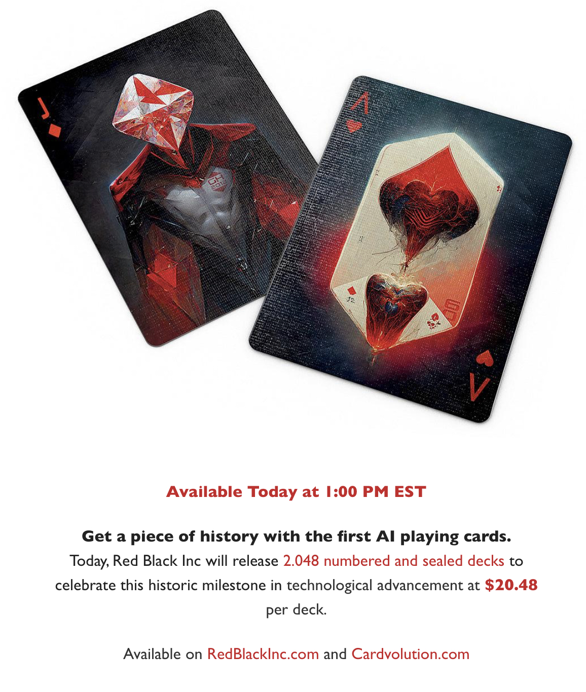 I announced it before and I'm pre-selling it, but David Blaine's deck for sure will be on the shelves before mine. I don't really know what "counts" and if it really matters, for sure it was just a matter of time. I still have my personal take on the AI-generated images topic and the only important thing to me is to be true to my concept.GandalfPC wrote: ↑Thu Nov 17, 2022 9:43 pm There is Taipestry by Riccardo Conturbia of course (don’t know if there was another on kickstarter)