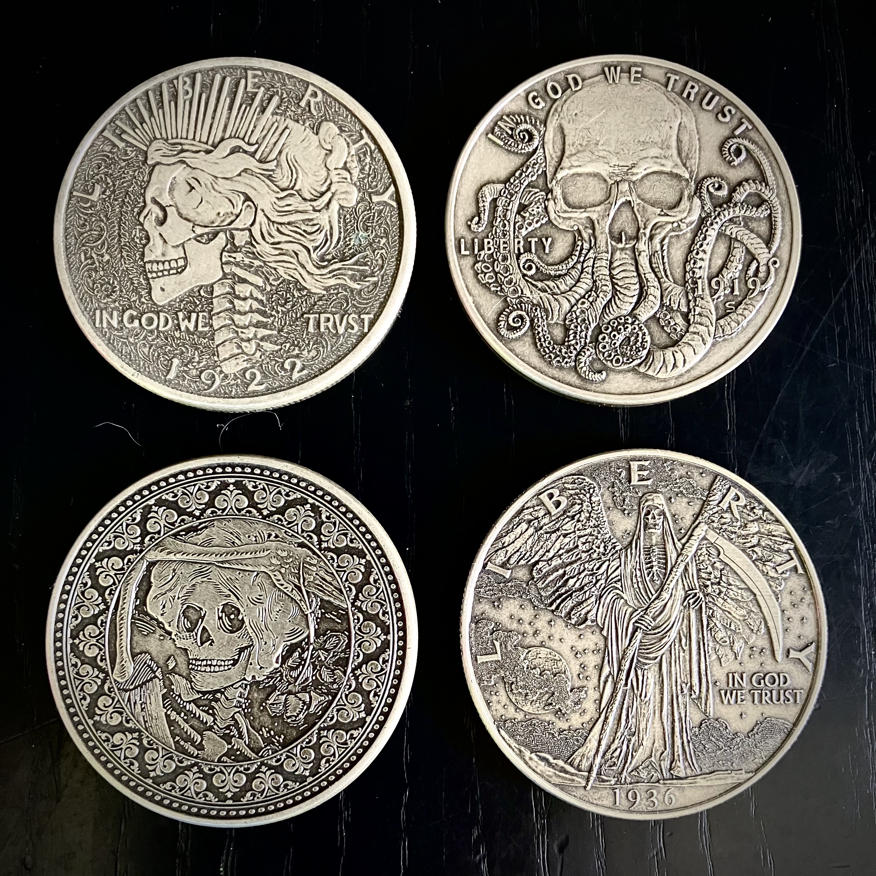 Bottom from Left: Luminosity, Ecliptic Antique Silver Finish, Wasteland Alice clay poker chip, Master Series Darklordz Black Nickel.