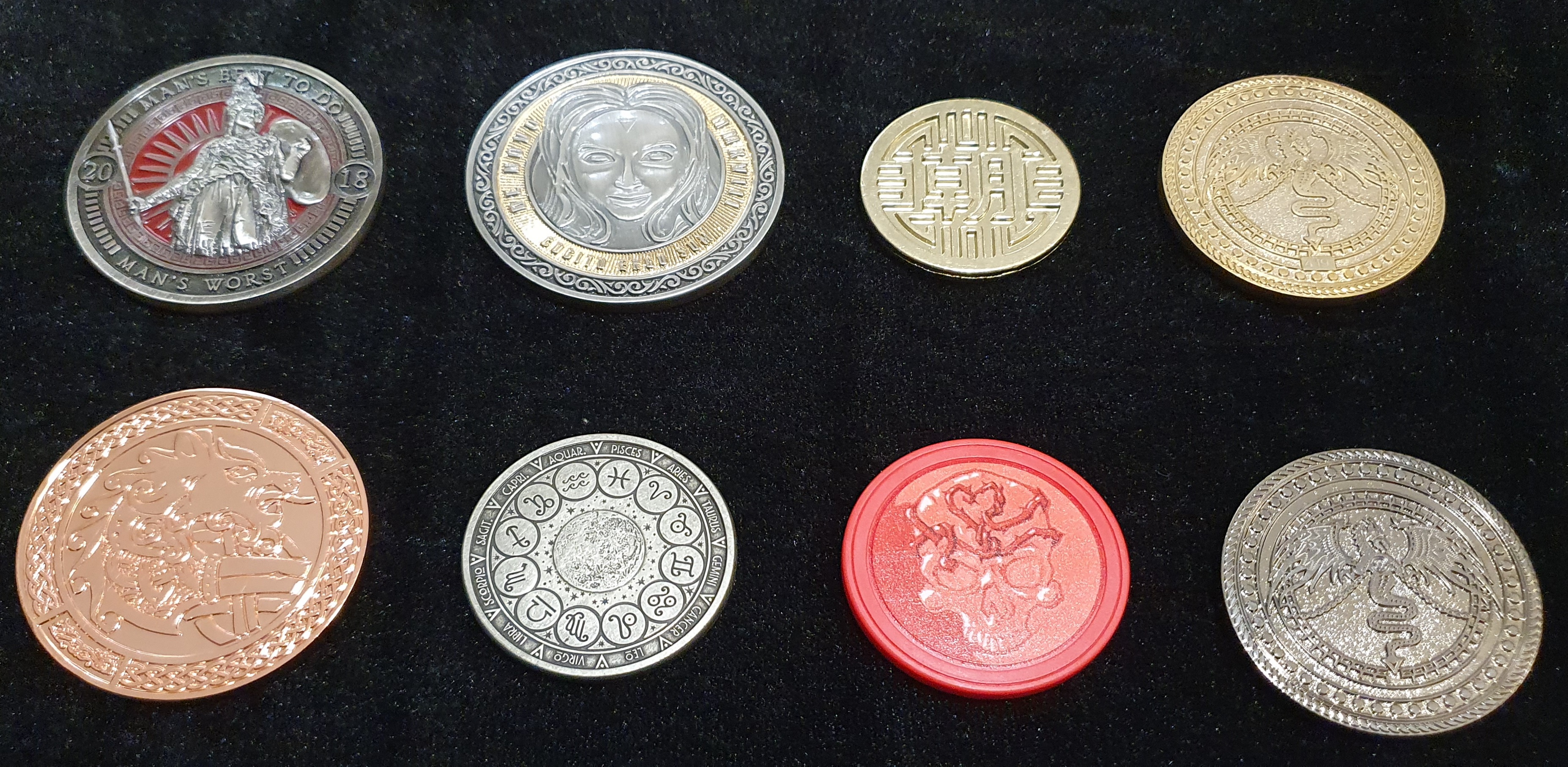 The first image shows my least favourite coins, including the Princess Bride, Cthulhu and a few dragon coins, whilst the second image highlights my favourites including White Rabbit and Name of the Wind (3 coins) along with the shot of the reverse side logo.