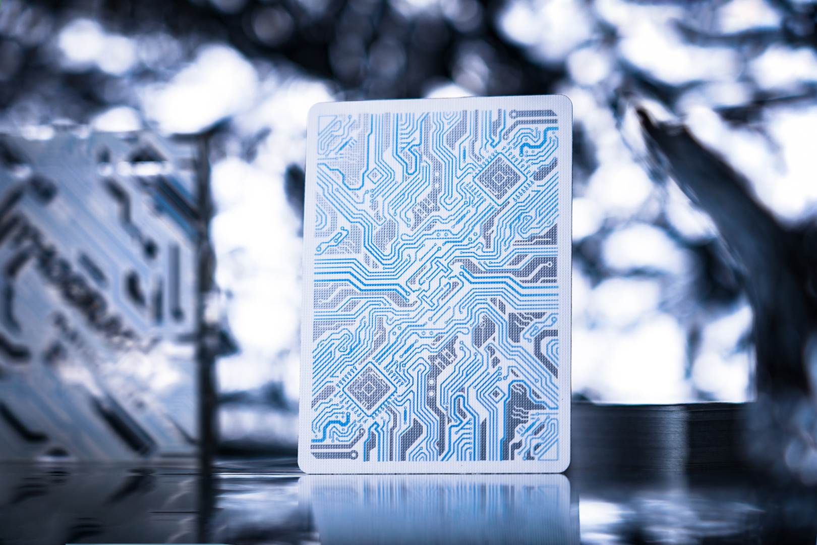 The unique feature here is the use of color-changing UV ink, which is found on every aspect of the deck. When illuminated with a UV light source, hidden circuits are revealed. The goal has been to use inks that show some of this effect even under natural sunlight outdoors, without needing a UV light.