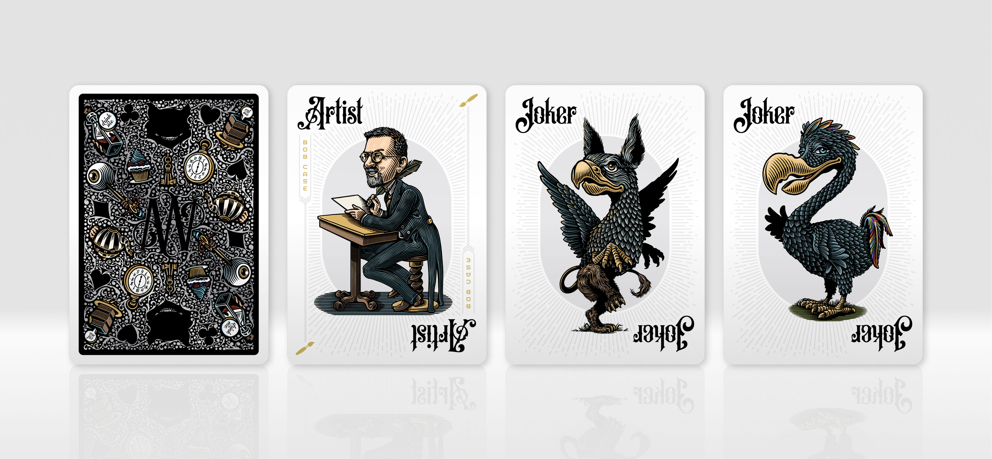 I love most everything I’m seeing except the aces. They don’t seem to fit the theme well and feel disconnected from the rest of the deck. It’s just basically an Alice item on a heart, club or diamond. I think there’s room to actually integrate these whacky characters into the aces themselves but that’s just my opinion.