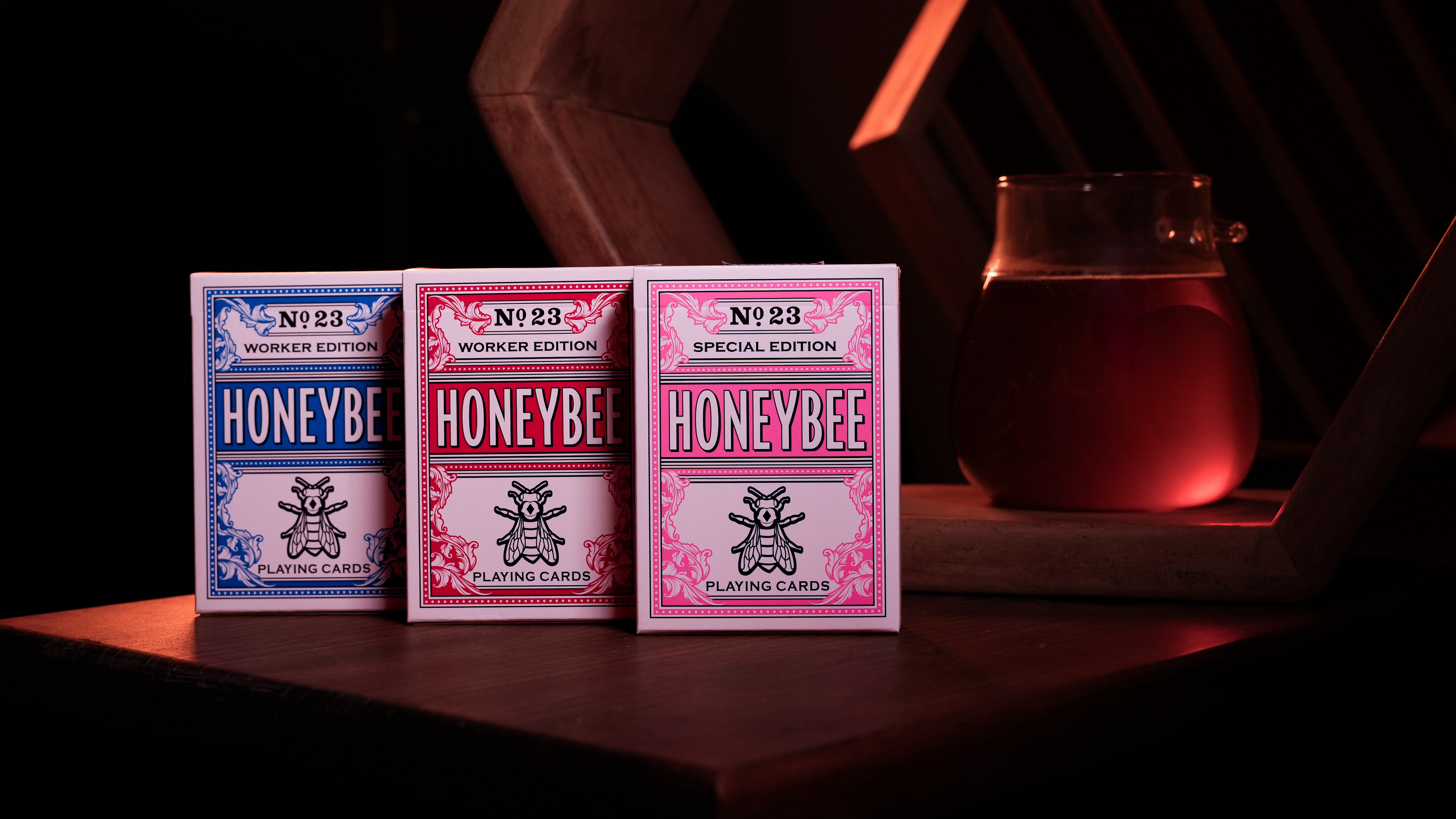 The biggest design change to the decks is the inclusion of the little bee insect on the back design. The Elite Edition were just the borderless honeycomb pattern with nothing else. The Worker Edition is the same background pattern, but the two bees have been added back to the design.