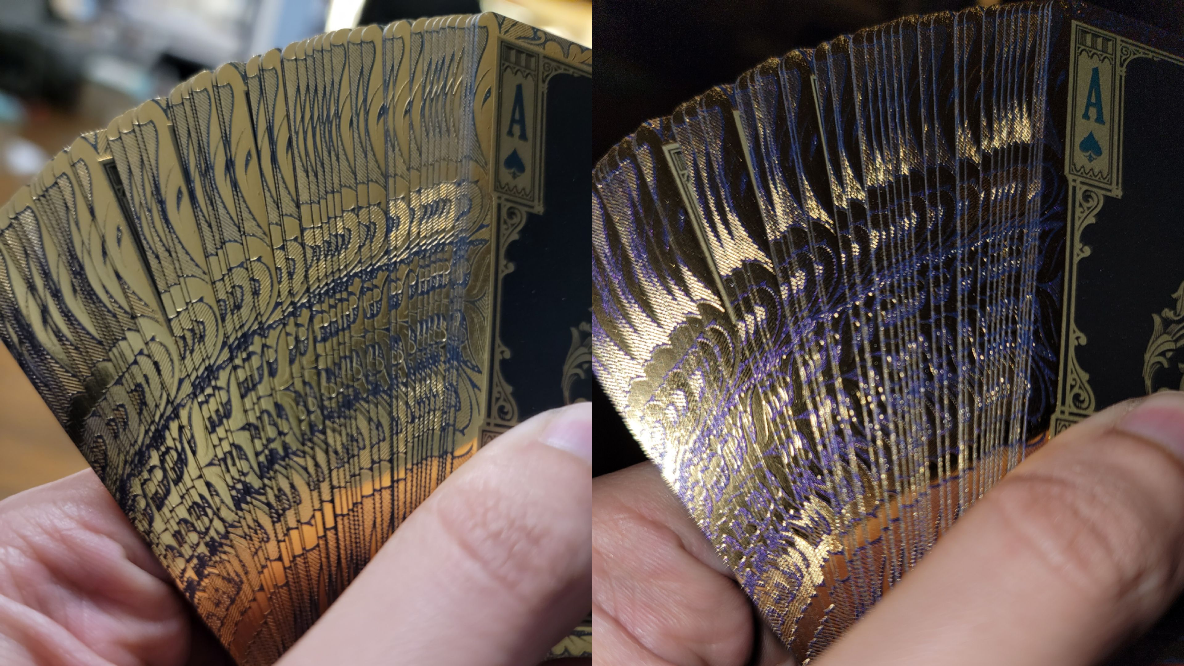 I owe Redemption VIV an apology. Just like the rest of the previous decks, the tucks are shown. We assumed that cards were just put inside of a Redemption box. SMH. The actual silver on gold backs do shine really good in light and fan very well. I'm pleased.