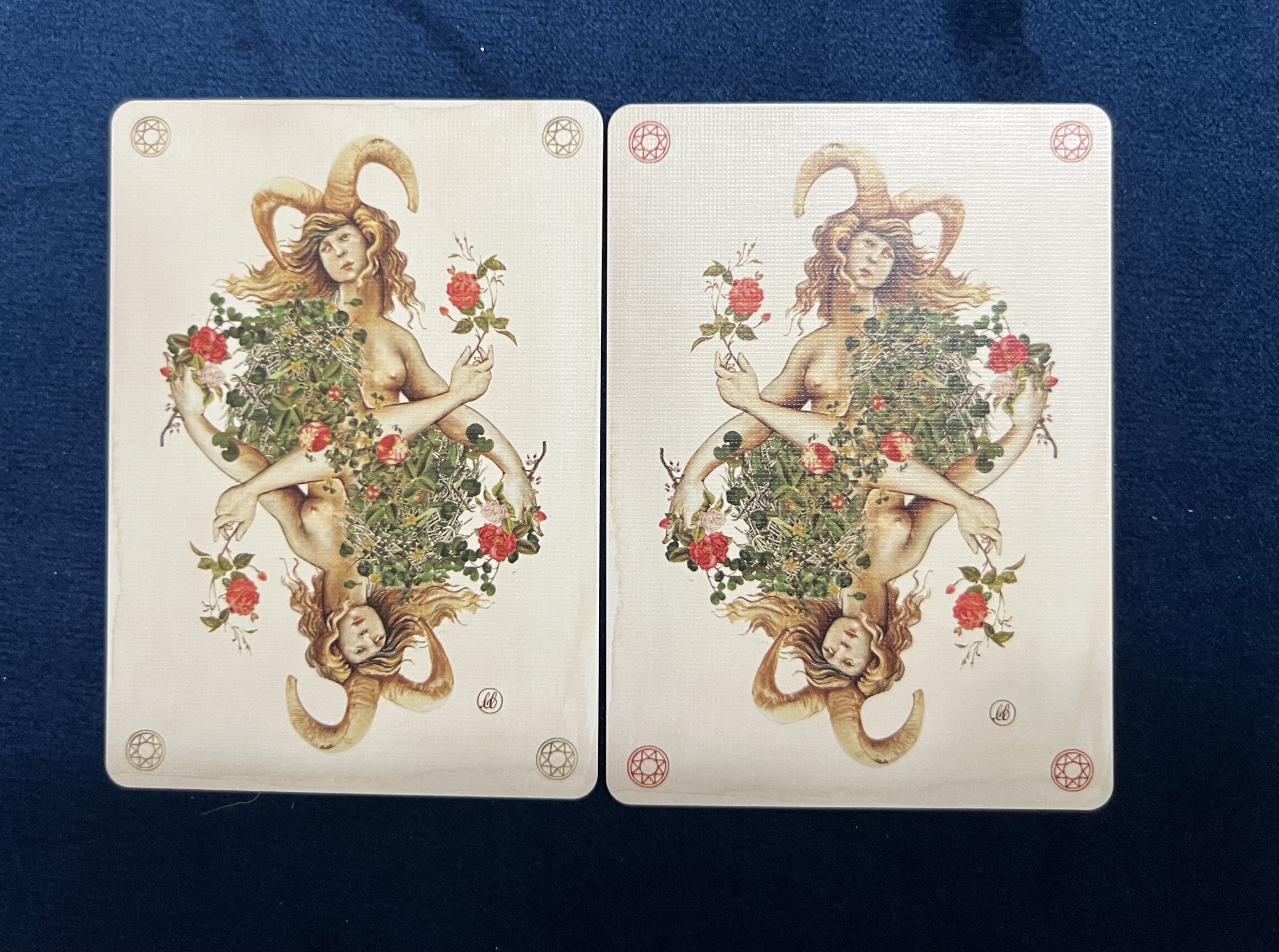 I would have picked these up if it weren't for it being basically a new tuck for the earlier Ivory Edition printed by USPCC, which featured two more cards as a diptych. For these type of classy decks from Uusi, I prefer the sturdier stock of Expert's Taiwanese printer to USPCC. Nonetheless, the additional diptych is enough to cover the slightly flimsier USPCC printing.