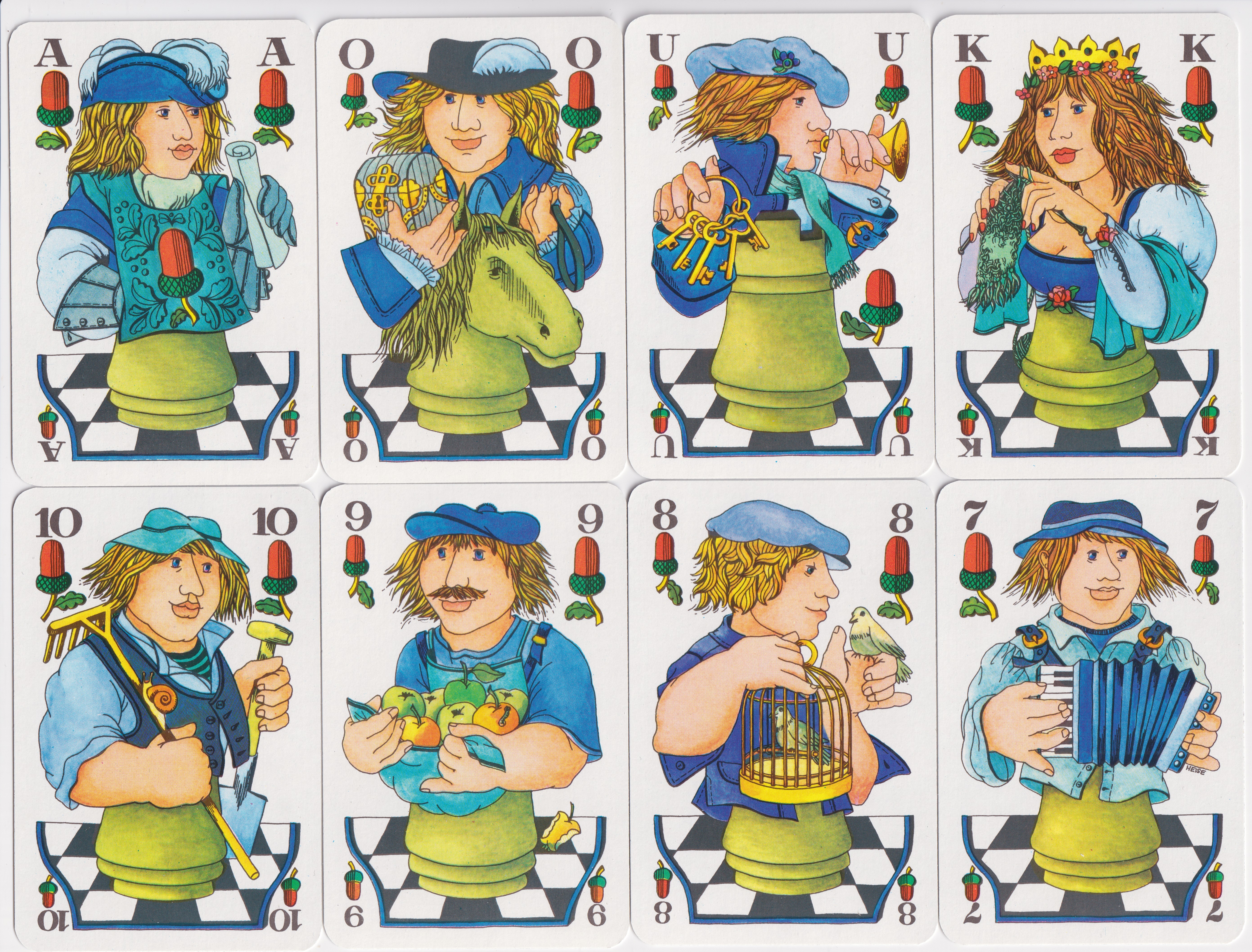 Acorns are linked with ceremonial decoration, with processions and their banners, drummers, and various pranks. Leaves show hunting scenes. Hearts are associated with love and chivalry, and finally, bells are associated with the fool's costume and call to mind an impromptu comedy that bids to satisfy a higher literary appetite.