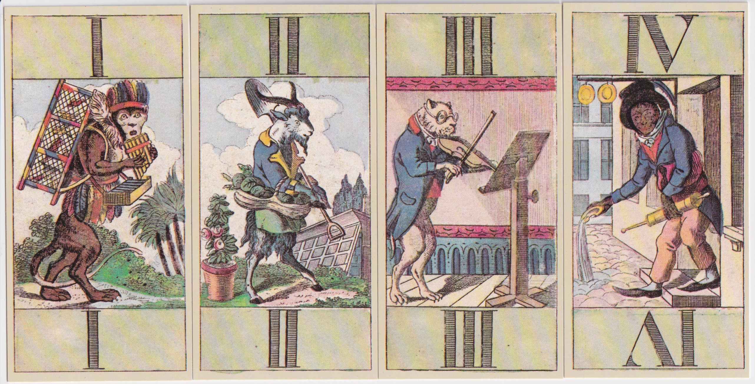In the engraving "The Disgusting World," a donkey became a barber. In another illustration, a ram cuts someone's hair. Years after that deck was published, Wilhelm