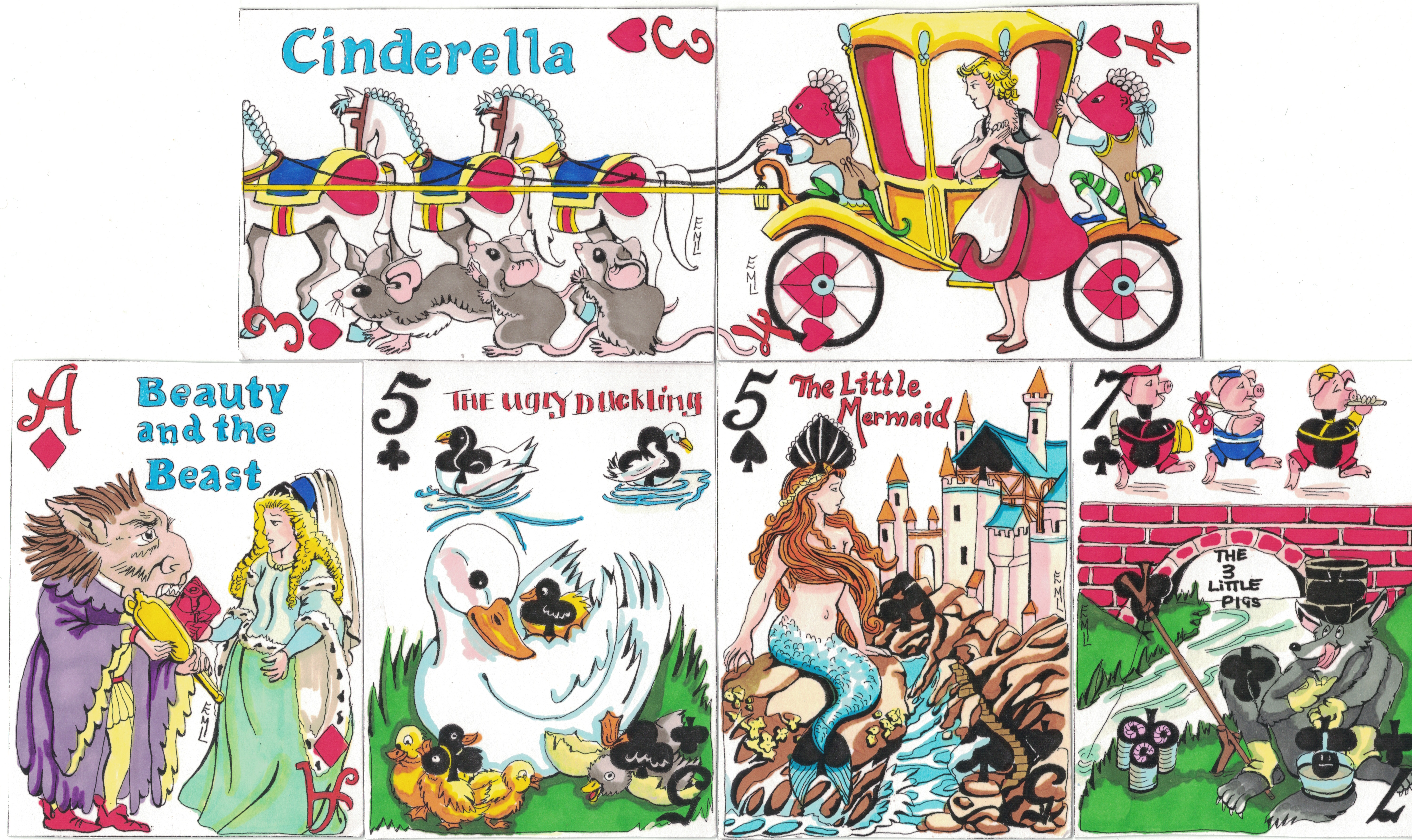 In Orphan there were a total of 21 playing cards in 5 groups appearing on 5 pages of the book. Thackeray's daughter supplied comments about the cards, and those comments appear on on the opposite facing pages. Each of the 5 groups had a title: (i) "Playing-Cards"; (ii) "Clubs and Croziers"; (iii) "Shakespeare, Byron, Miss Smith, etc."; (iv) "List, List, O List!"; and (v) "La Raison du Plus Fort"
