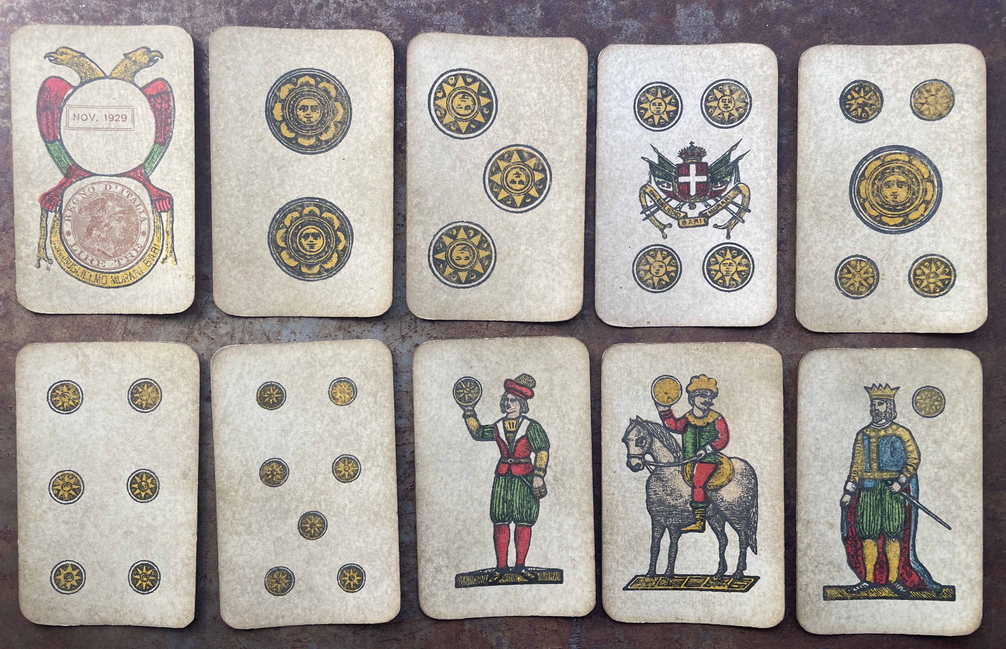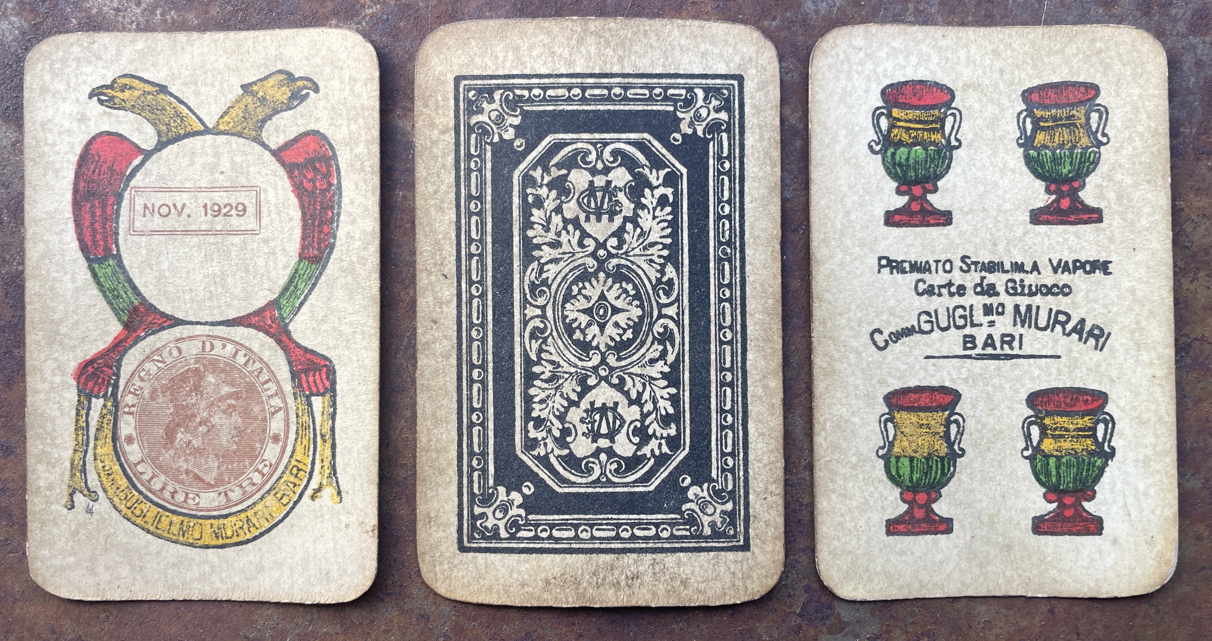 No mailman today due to President's Day, so, in recognition of the Olympics, here is a 1929 deck from Italian manufacturer Gugliemo Murari out of Bari, Italy. I believe these are hand colored. Cards are smaller than normal measuring 3 1/4 x 2 1/16 inches. It is a 40 card deck with 1-7 then three court cards, which is typical in Italy. Spanish suits of Cups, Coins, Clubs, and Swords.