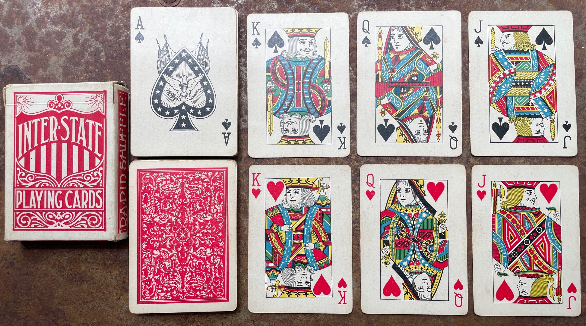 Post-vacay Wednesday Mailman Monday - Just got back into town and the Mailman was kind enough to drop off some items for me while I was gone. This is an interesting deck, because it provides more evidence for a link between American Playing Card Co. and Western Press. Same exact back design, first with American Playing Card Co and then with Western Press with the same courts, and then the back design again with a later Western (probably WPL) Interstate deck with new court designs. And then WPL beefed up the design with more points on the center star and thicker lines and even more new courts. Check them out.