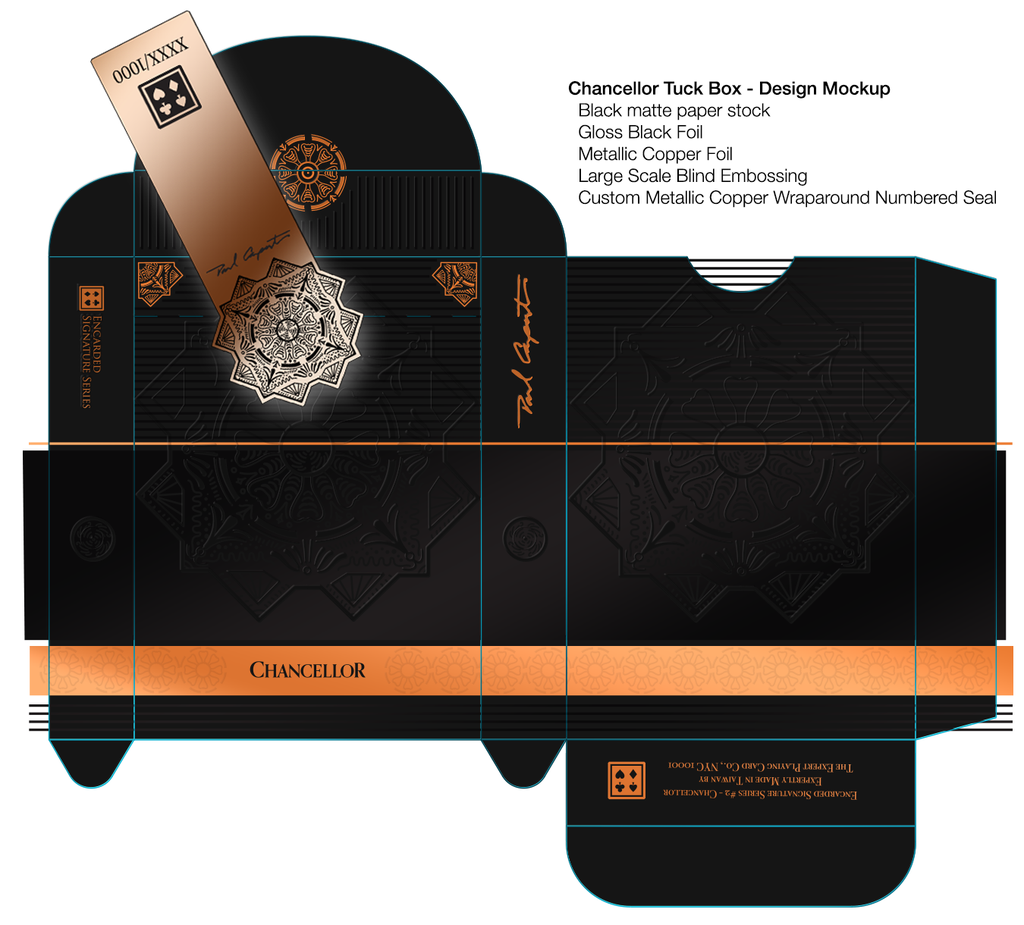 It will use the black stock of Zenith but all the detail will be via large scale blind embossing, copper and gloss black foils. The digital printer proof would be completely confusing to folks and result in a thousand questions on why it looks like a huge jumble of "stuff" on top of each other, so I have to do a mockup that tries to capture what it will look like, but haven't gotten it satisfactory yet.sms69x wrote:When will we see the box?