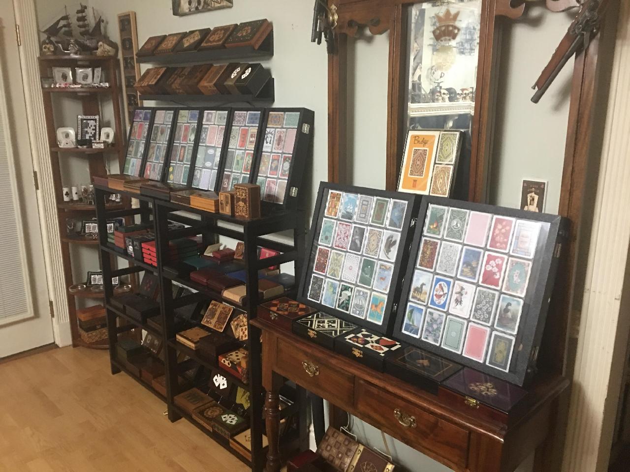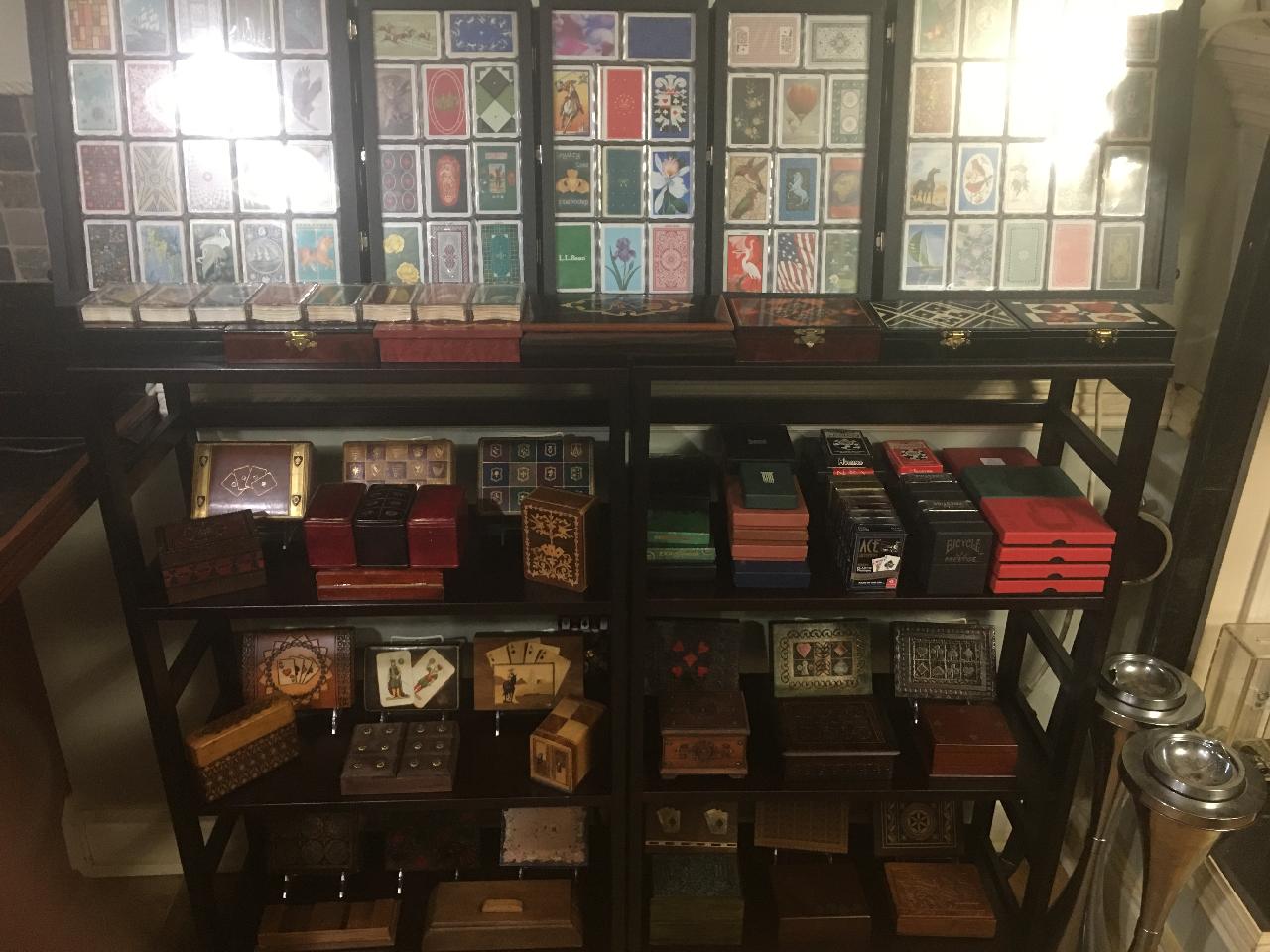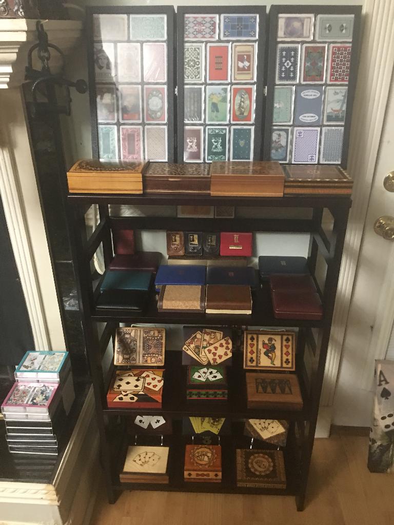For displaying, I keep one set of each Kem style in a glass-faced display case. I also keep some more special Kems in their original luxury cases on one of the shelves, but all of them are displayed face out in the glass cases. All the wooden boxes you see on the lower shelves are other casino-quality plastic/acetate playing cards made by Bicycle, Cartamundi, Copag, Da Vinci, Dal Negro, Fournier, Gemaco and Modiano.