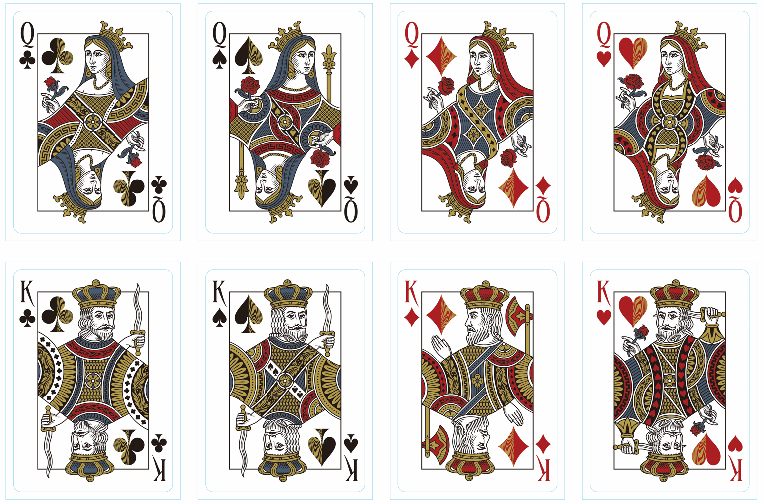 Repeating faces & crowns on the Queens make me lose some enthusiasm. The Kings are mostly in that same boat. Pips look super awesome.