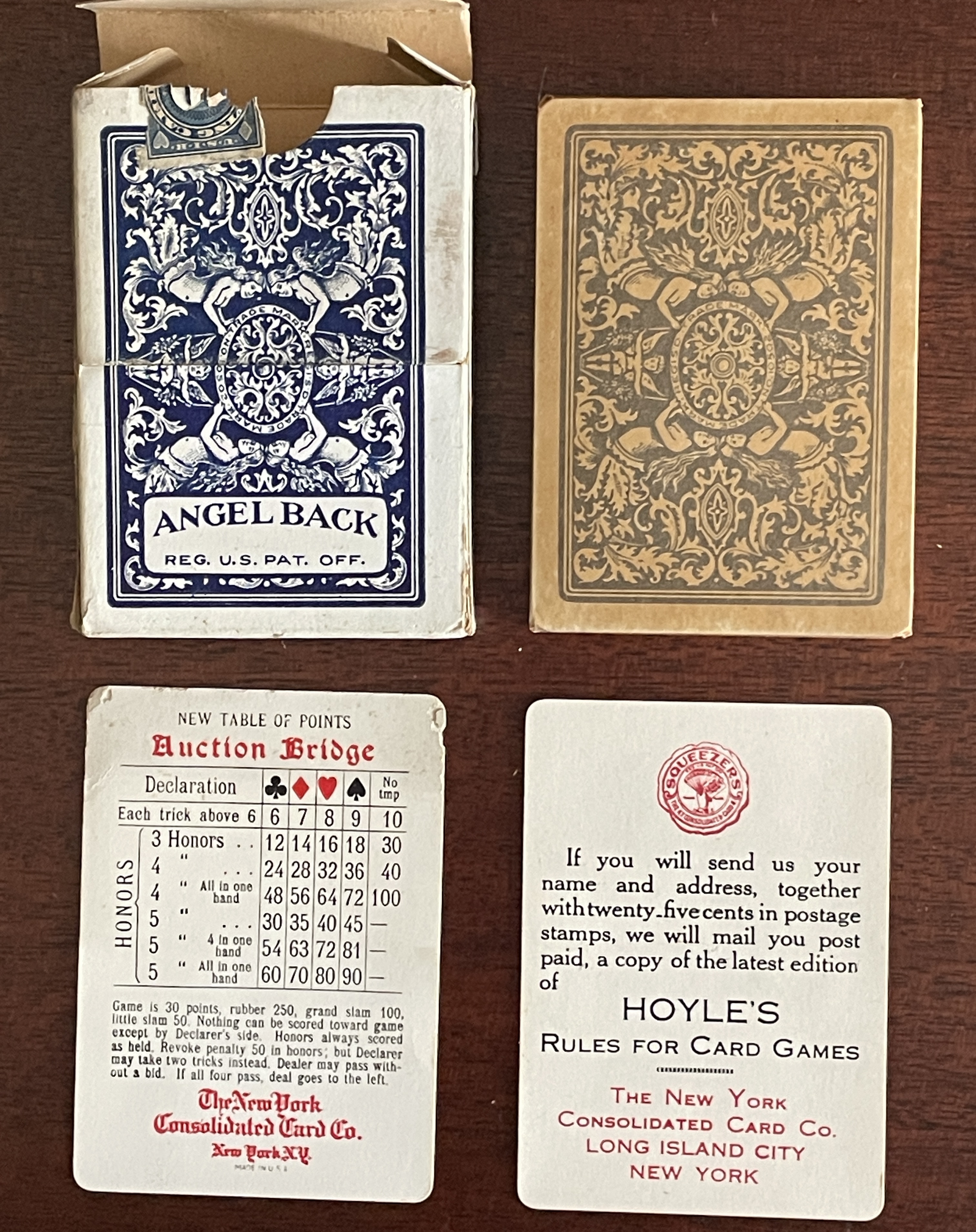 I received 3 sealed decks of Bee Smooth Finish playing cards with the square 10 cent tax stamp which dates them to between 1924 and 1929. All three tuck boxes have a slit in them for a demo card which is an Auction Bridge Card, and two of the demo cards are present. Removing the demo card and peeking through the slot, I received a surprise. There is a red back card visible in the tuck, and the card back is not an angel back. But this is a blue angel back tuck box, so what is going on? I surmised that maybe the visible card was another extra card and the blue deck was still wrapped in there, but I couldn't see anything. I gently squeezed the tuck on both sides to see if I could hear the glassine paper crinkle or something, but could not hear anything definitive. Only course of action left was to open the deck.