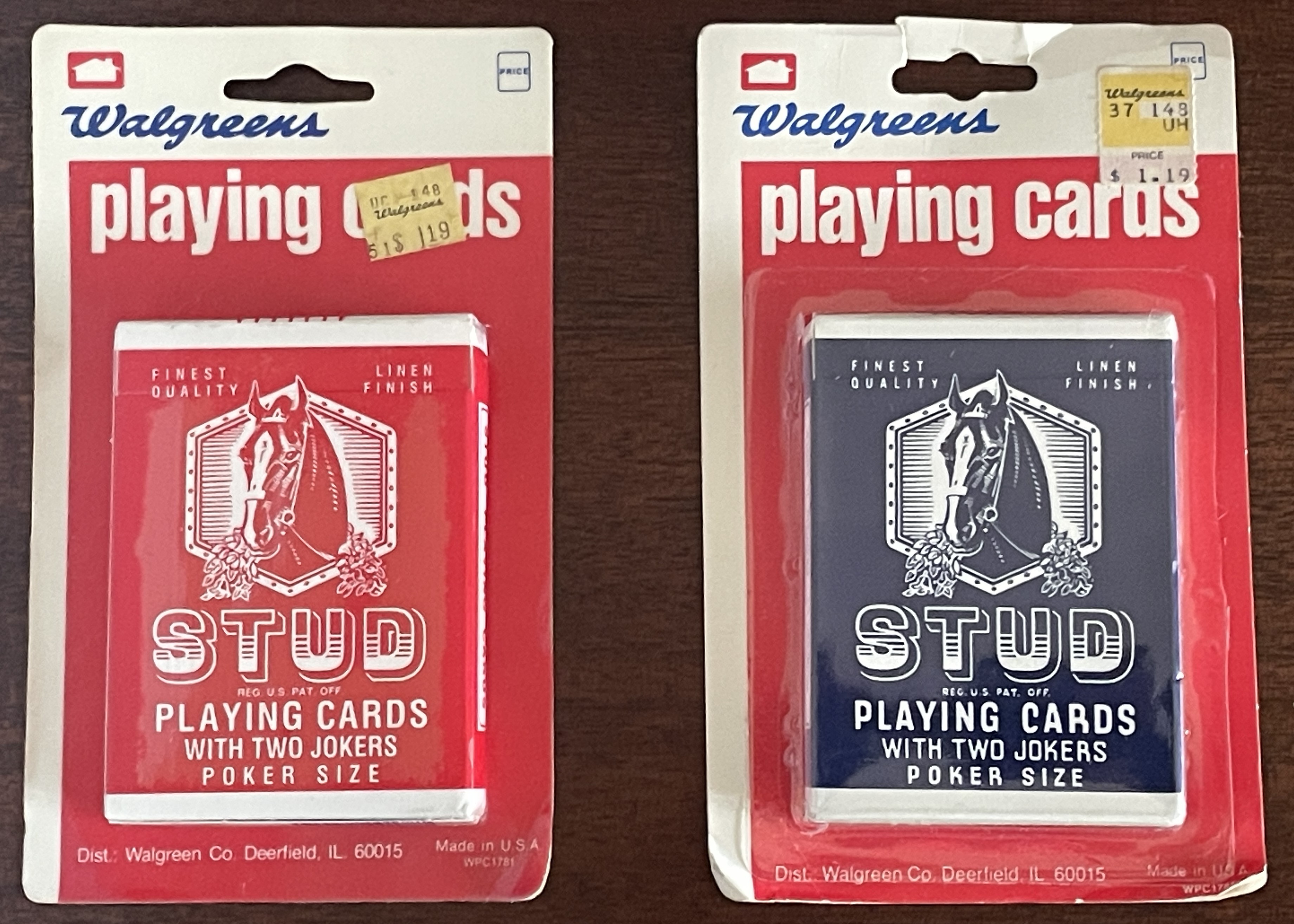 Today we have two sealed decks of Walgreens Stud Playing Cards. The red deck is by Hoyle, and the blue deck by USPCC. There were a few years in the mid-1980s when USPCC workers were on strike, so ARRCO stepped in, and then Hoyle printed the Stud playing cards. USPCC took back over in 1989. There is a great thread over at Playing Card Forum that traces the history of Studs. Be sure to check it out if you want to learn more. https://www.playingcardforum.com/index. ... ic=13807.0