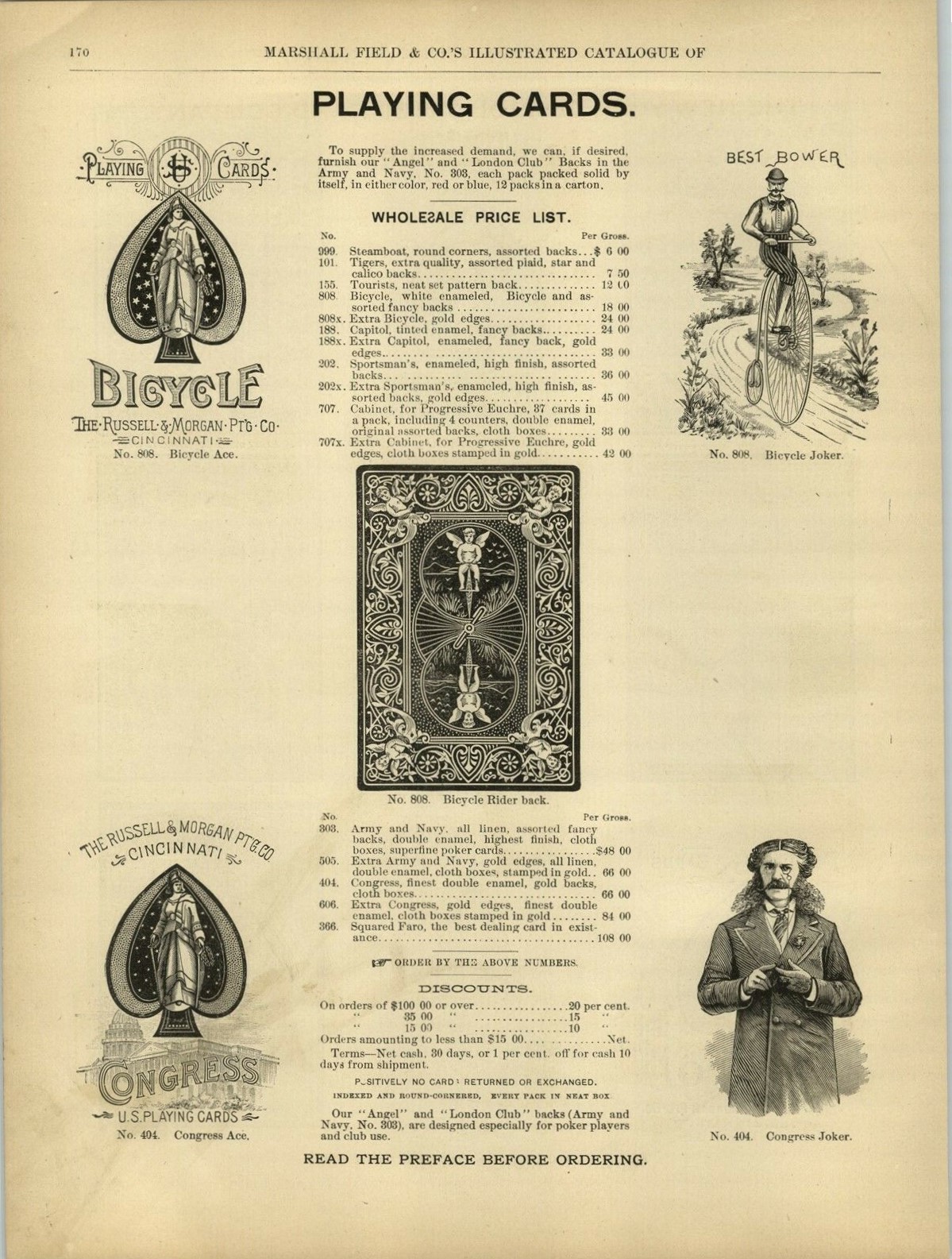 Here are 2 pages from the Marshall Field & Co.'s Illustrated Catalogue of Holiday Goods, Druggist's Sundries, Stationary, Etc., c1886, for Russell & Morgan Ptg. Co. Shows the original Bicycle Ace of Spades and the original Best Bower joker, along with Congress, Army & Navy, Sportsman's and Capitol Aces and backs.