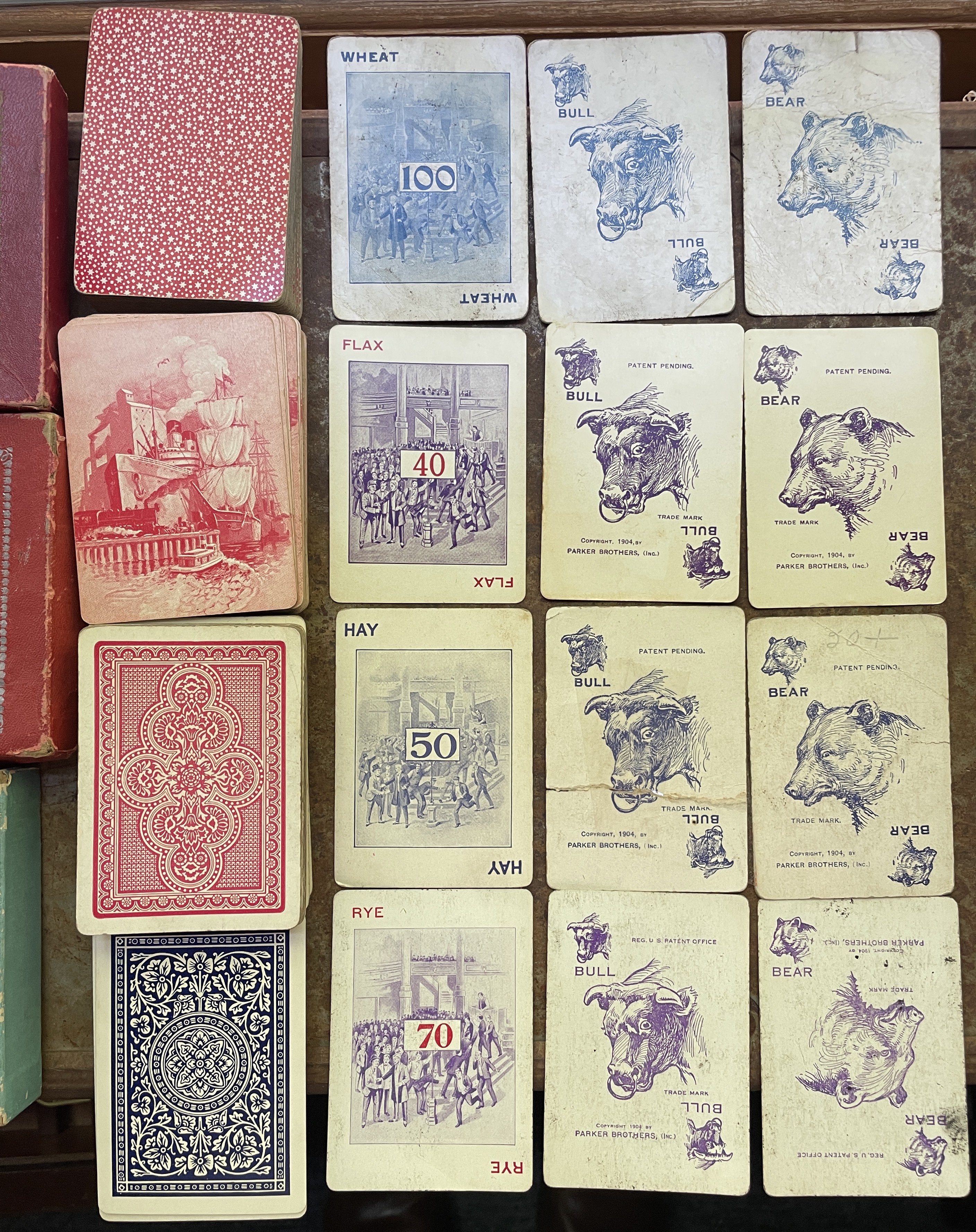 You are probably right about the new editions. I think the three sets here cover around 20 years, so would make sense they'd do a refresh every now and then. As for the Bull and Bear, these were two special cards added to the deck to enhance game play. I believe the original deck in 1903 did not have them, and they were added in 1904. Here's a pic of the front of the cards in these three sets and the Bull and Bear cards to see how the card faces also changed over time (not much). Looking at these and the slight changes, I'd wager top row is oldest, followed by third row, then second row, then last row.