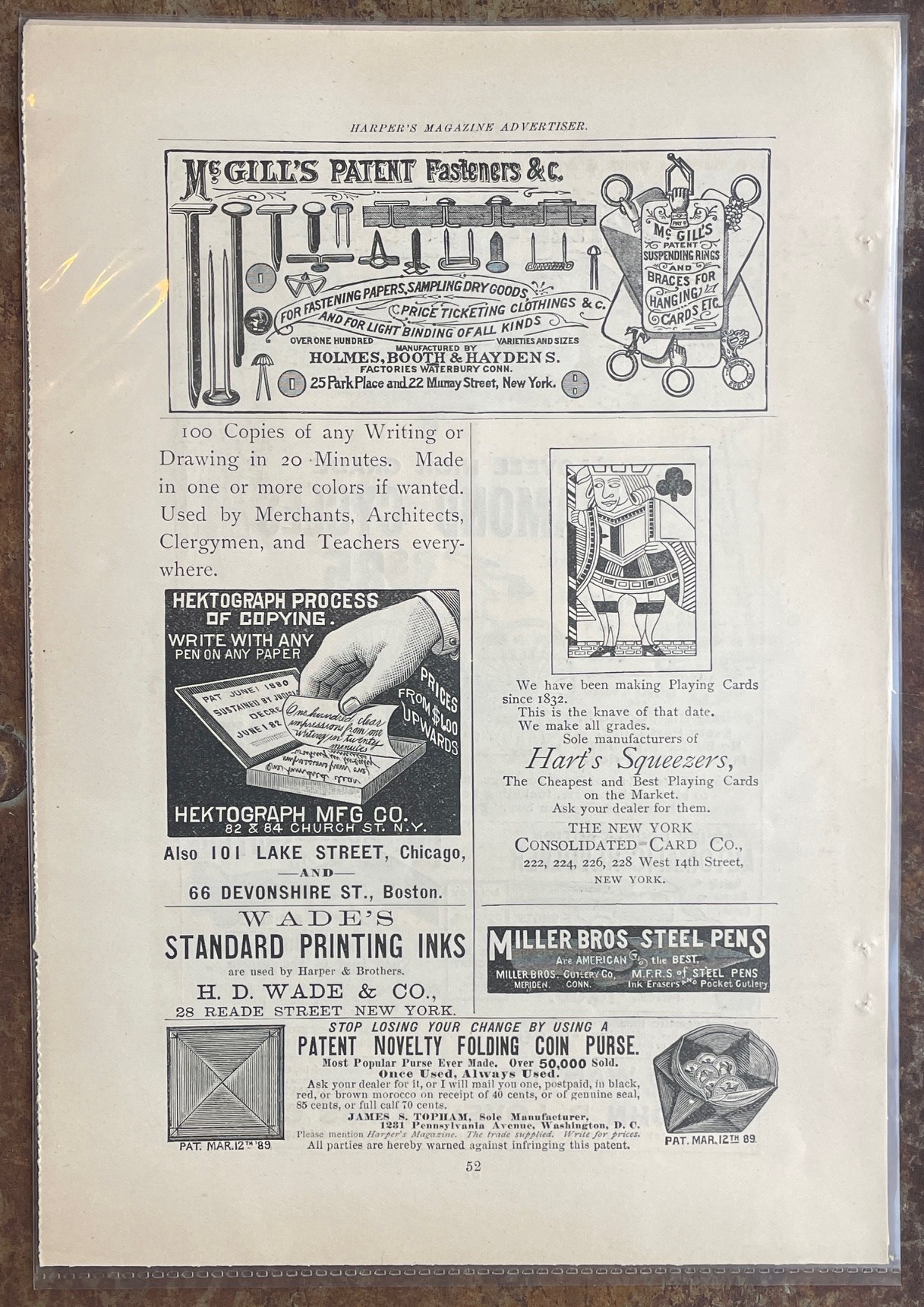 Had to dig back into the Archives for today's Ephemera Friday, and I found some old playing cards advertisements for New York Consolidated Card Co. dating from 1891 and 1892. These first 3 ads are from late 1891, and I'll post the 1892 ads next week. It is always interesting to see the other items advertised on these pages from magazines of the time.