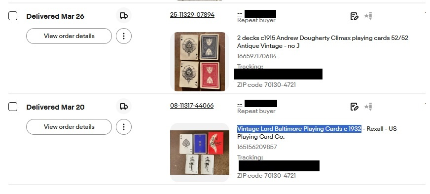 In the comments, someone mentioned that the cards looked like some of mine on eBay, and they did look familiar, very familiar. Turns out in March of 2024 I sold three decks of cards to a guy in New Orleans with the same name as the prop master for Sinners, a red and blue set of Dougherty Climax with the crossed racquets and a Lord Baltimore deck with the blue back. Here's my ebay history screengrab: