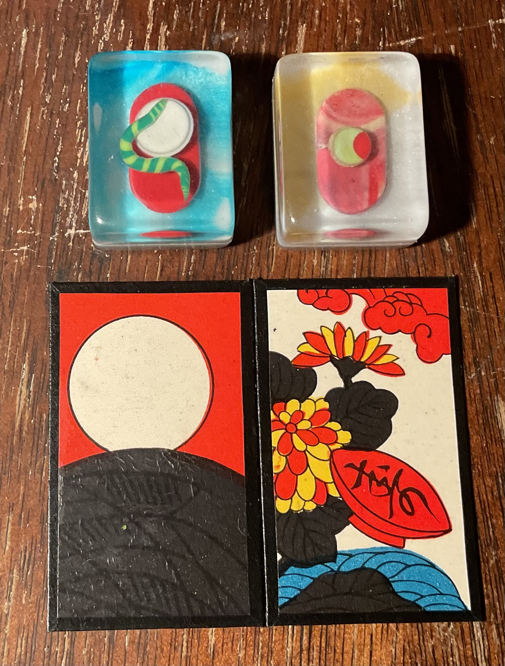 Wanted to cast my own set of hanafuda tiles with little sculptured scenes inside - made a bunch of molds using standard small mahjong tiles and made a few gooey messes with some casting resin, then a few bubbly messes, and finally some non-messes