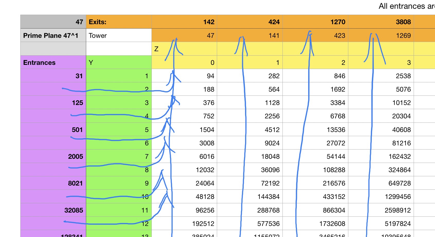 And these are the towers - the first column is the base number line - all the rest are the powers of two times that base number - the towers over each number that is that numbers power of two tower.
