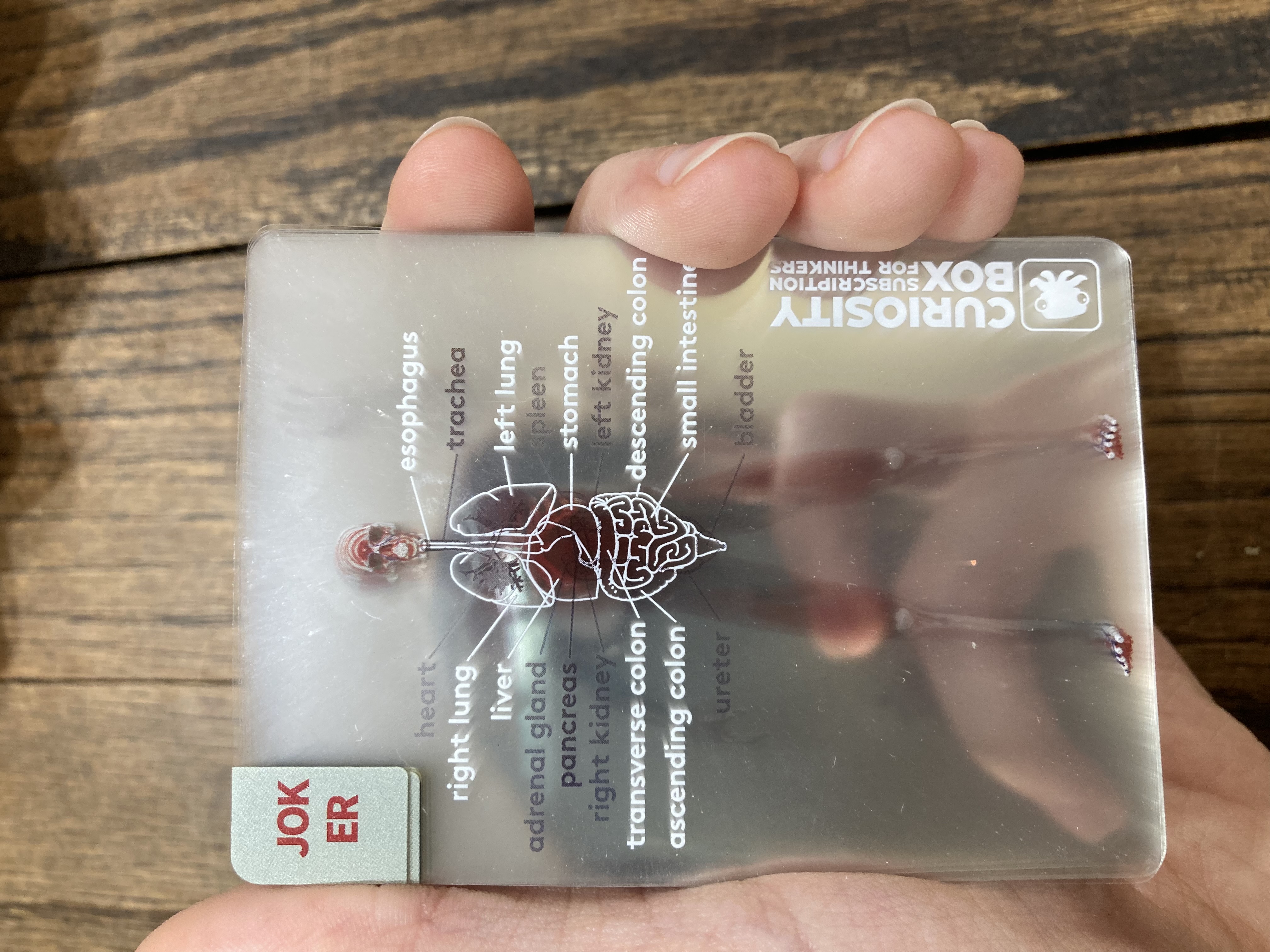 ☆REMARKS: Absolutely beautiful deck, the coronal slices are gorgeous. Their colors are vibrant and the detail is fantastic. The glare in my photos is undesirable and affects my ability to capture their appearance well, however I did my best. When held alone, the clarity of the individual clear cards is so incredibly good: when held out the colored portions sometimes just look like they’re free-floating. I absolutely thought these may be a pain to shuffle, but was so pleasantly surprised to find out that they shuffle like a DREAM. One of the best flexes and slides I’ve ever felt in a shuffle. Beautiful sound, too. I straight-up involuntarily gasped. The jokers working as an overlay to identify and label major organs and bones is super creative, I was delighted by this feature. These cards’ aesthetic appearance is everything I hoped it would be. ***(NOTE: Fondness of design/design concept may be an acquired taste, as anybody with no interest in anatomy/science/medical topics may not find the same type of appeal. However, I would like to assert that my review of the actual quality of design is unbiased: I enjoy medical themed decks and anatomy, but I am still very particular about the quality of executing those themes. If this deck had been badly printed, had dissatisfying clarity, any struggle to shuffle, etc. I would say so. The colors are vibrant and the lines are crisp. The detail put into this creation is truly admirable.)